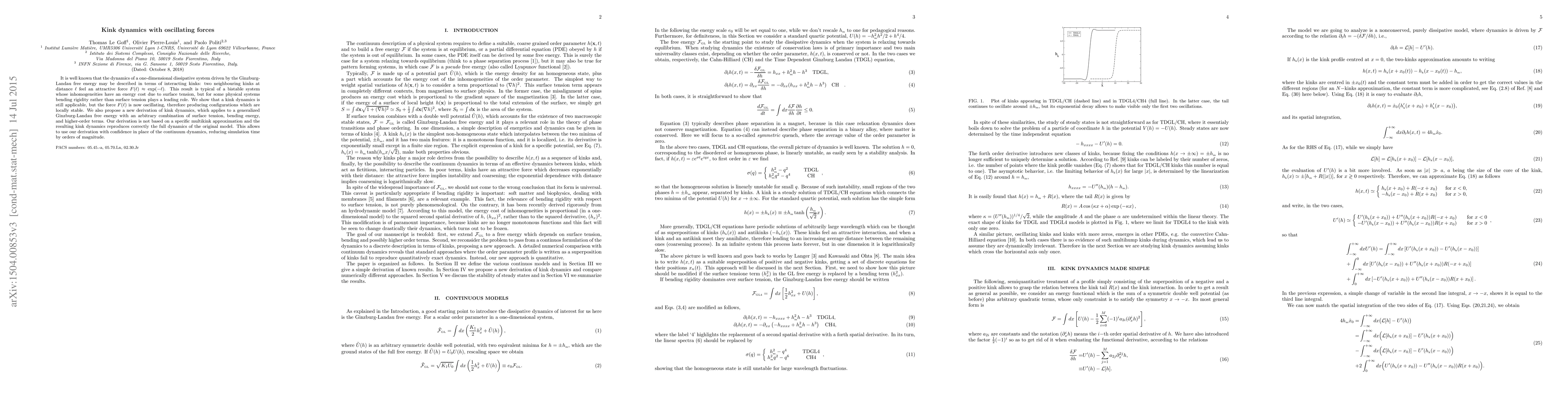This paper explores kink dynamics in one-dimensional dissipative systems driven by generalized Ginzburg-Landau free energy, showing that the attractive force between kinks can oscillate, leading to locally stable configurations. The authors propose a new derivation applicable to systems where bending rigidity is significant, which accurately reproduces the full dynamics of the original model and significantly reduces simulation time.