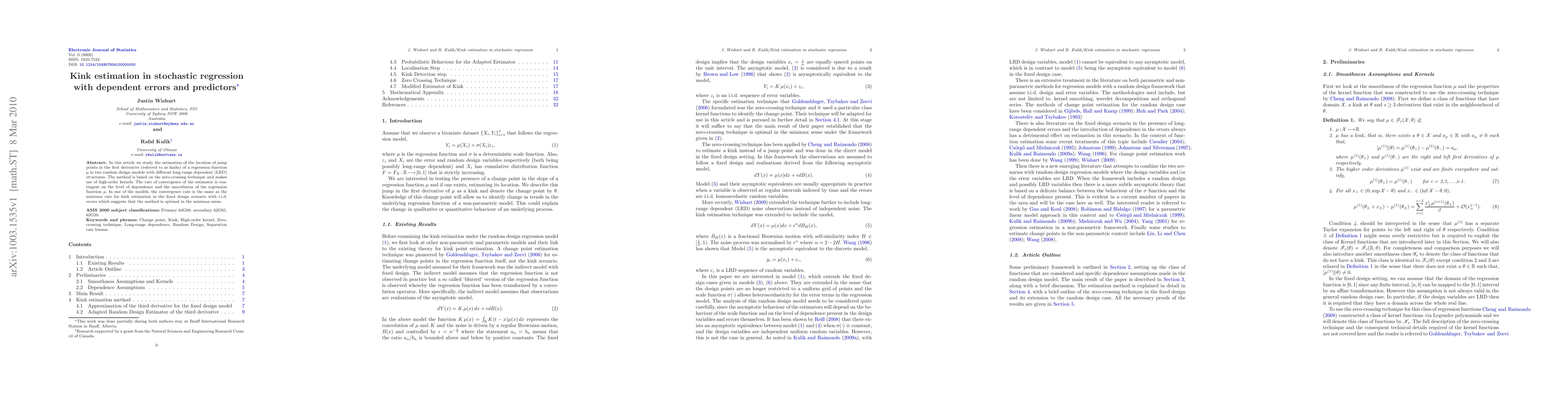 This paper investigates the estimation of kinks in the first derivative of a regression function under stochastic conditions with long-range dependent errors and predictors. The proposed zero-crossing technique using high-order kernels achieves convergence rates dependent on the regression function's smoothness and the level of dependence, with optimal performance in one model.