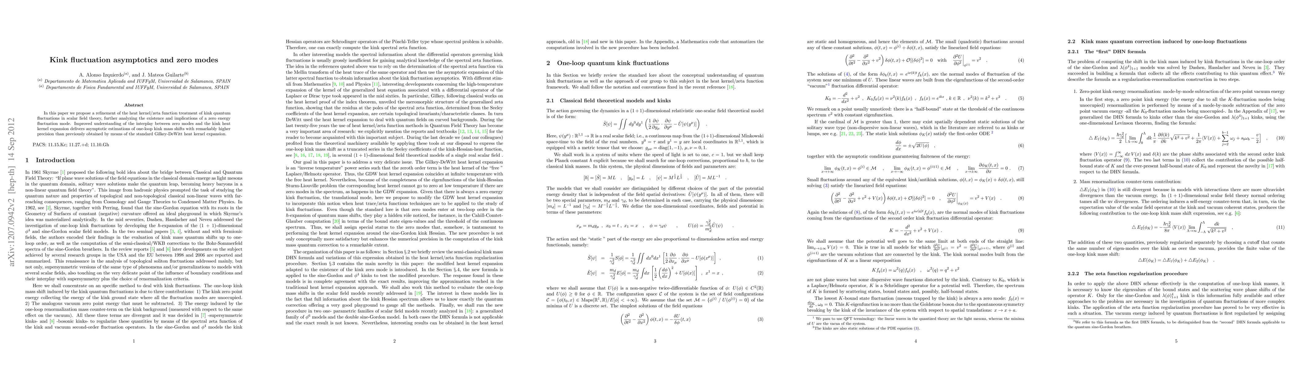 This paper refines the heat kernel/zeta function approach to study kink quantum fluctuations in scalar field theory, focusing on zero energy fluctuation modes. It provides more precise asymptotic estimations of one-loop kink mass shifts compared to the standard Gilkey-DeWitt method.