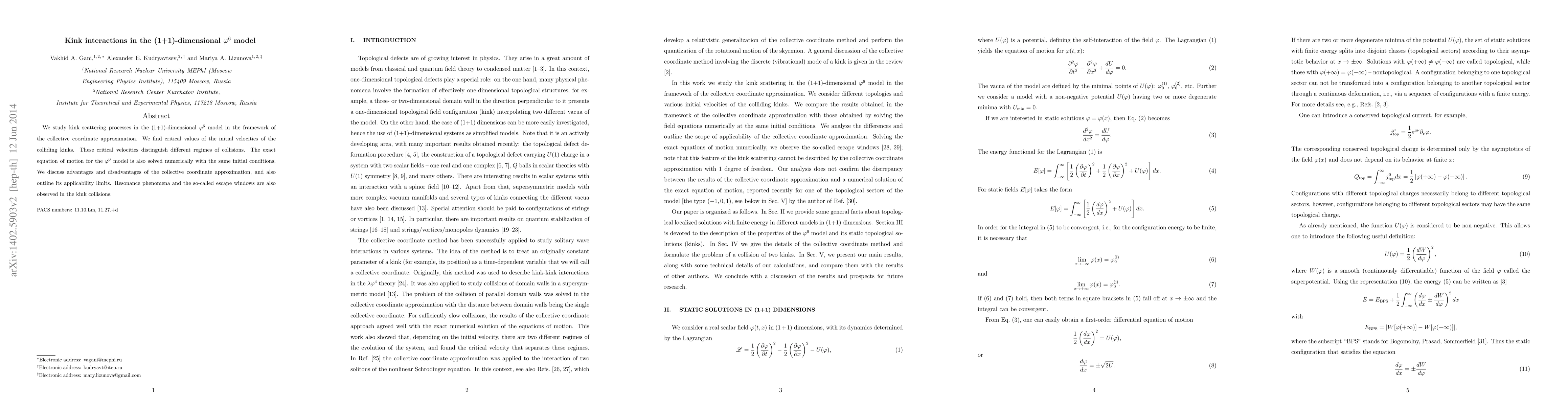 This paper investigates kink scattering in the (1+1)-dimensional $\varphi^6$ model using the collective coordinate approximation, identifying critical velocities that define distinct collision regimes and numerically solving the exact equation of motion. It discusses the method's advantages, limitations, and observes resonance phenomena and escape windows.