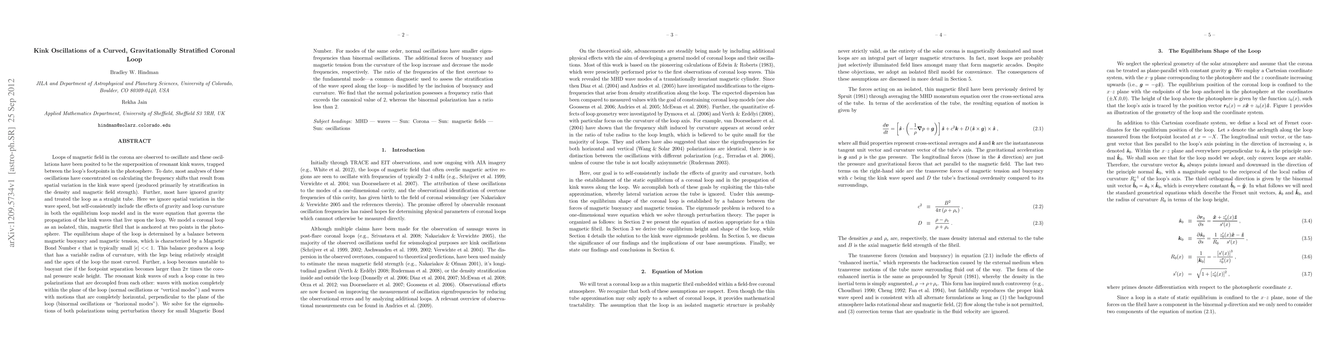 Loops of magnetic field in the corona are observed to oscillate and these oscillations have been posited to be the superposition of resonant kink waves. To date, most analyses of these oscillations have concentrated on calculating the frequency shifts that result from spatial variation in the kink wave speed. Further, most have ignored gravity and treated the loop as a straight tube. Here we ignore spatial variation in the wave speed, but self-consistently include the effects of gravity and loop curvature in both the equilibrium loop model and in the wave equation. We model a coronal loop as an isolated, thin, magnetic fibril that is anchored at two points in the photosphere. The equilibrium shape of the loop is determined by a balance between magnetic buoyancy and magnetic tension, which is characterized by a Magnetic Bond Number \epsilon, that is typically small |\epsilon| << 1. This balance produces a loop that has a variable radius of curvature. The resonant kink waves of such a loop come in two polarizations that are decoupled from each other: waves with motion completely within the plane of the loop (normal oscillations) and waves with motions that are completely horizontal, perpendicular to the plane of the loop (binormal oscillations). We solve for the eigensolutions of both polarizations using perturbation theory for small Magnetic Bond Number. For modes of the same order, normal oscillations have smaller eigenfrequencies than binormal oscillations. The additional forces of buoyancy and magnetic tension from the curvature of the loop increase and decrease the mode frequencies, respectively. The ratio of the frequencies of the first overtone to the fundamental mode is modified by the inclusion of buoyancy and curvature. We find that the normal polarization possesses a frequency ratio that exceeds the canonical value of 2, whereas the binormal polarization has a ratio less than 2.