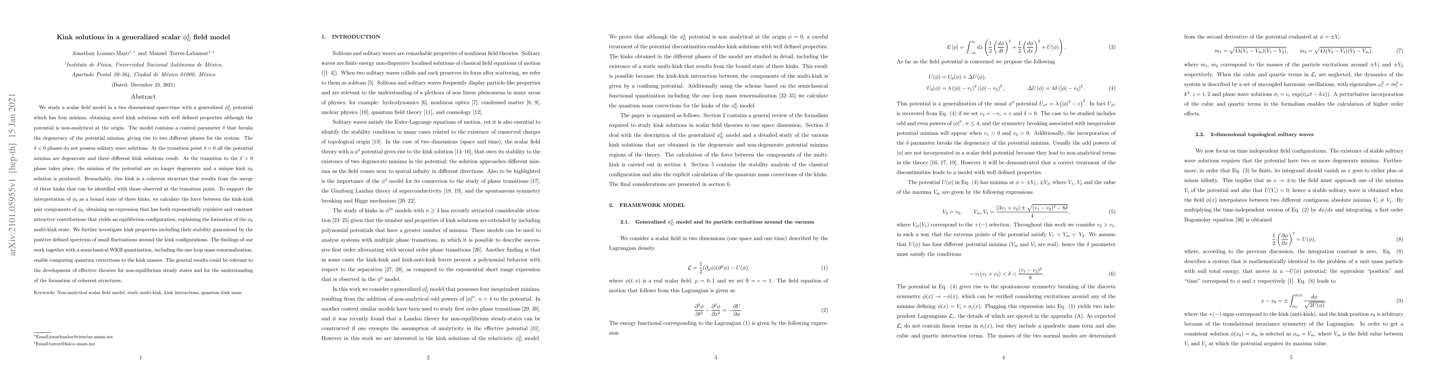 We study a scalar field model in a two dimensional space-time with a generalized $\phi^4_G$ potential which has four minima, obtaining novel kink solutions with well defined properties although the potential is non-analytical at the origin. The model contains a control parameter $\delta$ that breaks the degeneracy of the potential minima, giving rise to two different phases for the system. The $\delta<0$ phases do not possess solitary wave solutions. At the transition point $\delta=0$ all the potential minima are degenerate and three different kink solutions result. As the transition to the $\delta>0$ phase takes place, the minima of the potential are no longer degenerate and a unique kink $\phi_\delta$ solution is produced. Remarkably, this kink is a coherent structure that results from the merge of three kinks that can be identified with those observed at the transition point. To support the interpretation of $\phi_\delta$ as a bound state of three kinks, we calculate the force between the kink-kink pair components of $\phi_\delta$, obtaining an expression that has both exponentially repulsive and constant attractive contributions that yields an equilibrium configuration, explaining the formation of the $\phi_\delta$ multi-kink state. We further investigate kink properties including their stability guaranteed by the positive defined spectrum of small fluctuations around the kink configurations. The findings of our work together with a semiclassical WKB quantization, including the one loop mass renormalization, enable computing quantum corrections to the kink masses. The general results could be relevant to the development of effective theories for non-equilibrium steady states and for the understanding of the formation of coherent structures.