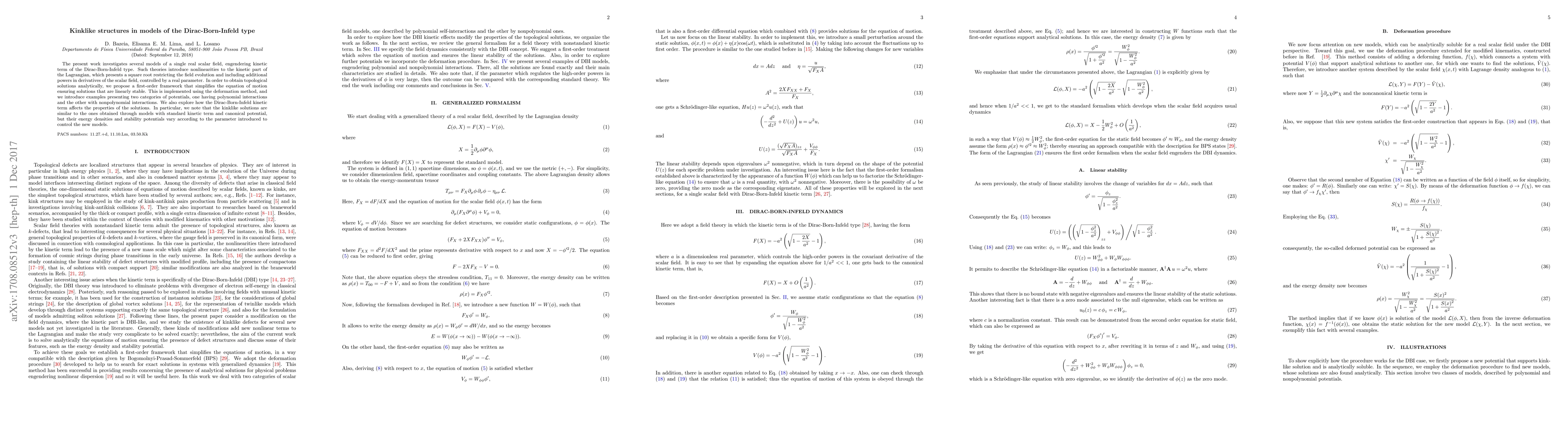 The present work investigates several models of a single real scalar field, engendering kinetic term of the Dirac-Born-Infeld type. Such theories introduce nonlinearities to the kinetic part of the Lagrangian, which presents a square root restricting the field evolution and including additional powers in derivatives of the scalar field, controlled by a real parameter. In order to obtain topological solutions analytically, we propose a first-order framework that simplifies the equation of motion ensuring solutions that are linearly stable. This is implemented using the deformation method, and we introduce examples presenting two categories of potentials, one having polynomial interactions and the other with nonpolynomial interactions. We also explore how the Dirac-Born-Infeld kinetic term affects the properties of the solutions. In particular, we note that the kinklike solutions are similar to the ones obtained through models with standard kinetic term and canonical potential, but their energy densities and stability potentials vary according to the parameter introduced to control the new models.