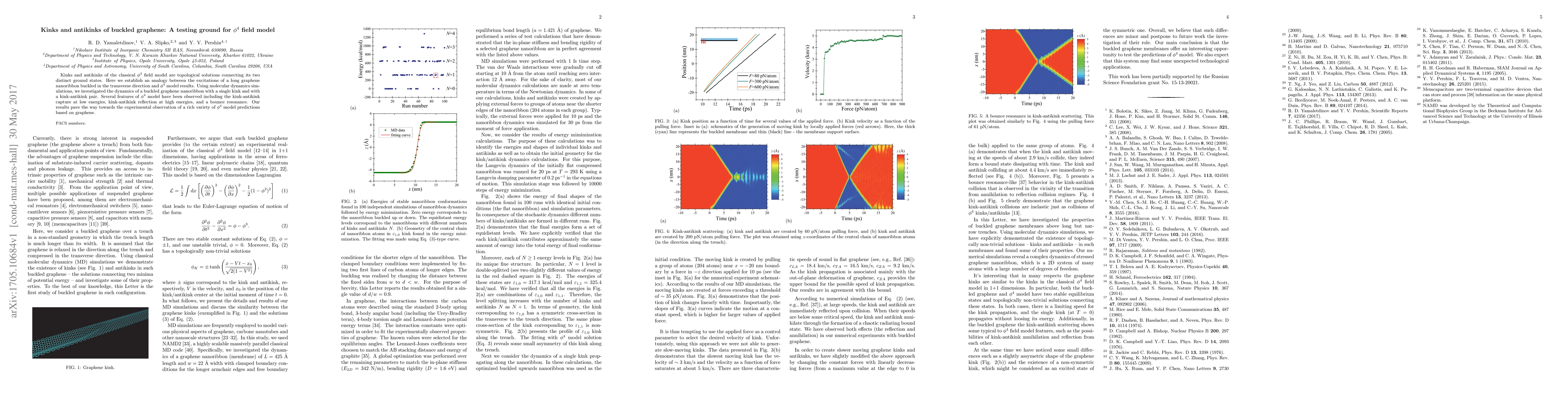 This paper establishes an analogy between kinks and antikinks in buckled graphene nanoribbons and topological solutions in the phi^4 field model. Molecular dynamics simulations reveal behaviors such as kink-antikink capture, reflection, and bounce resonance, mirroring phi^4 model predictions and suggesting graphene as a testing ground for such field models.