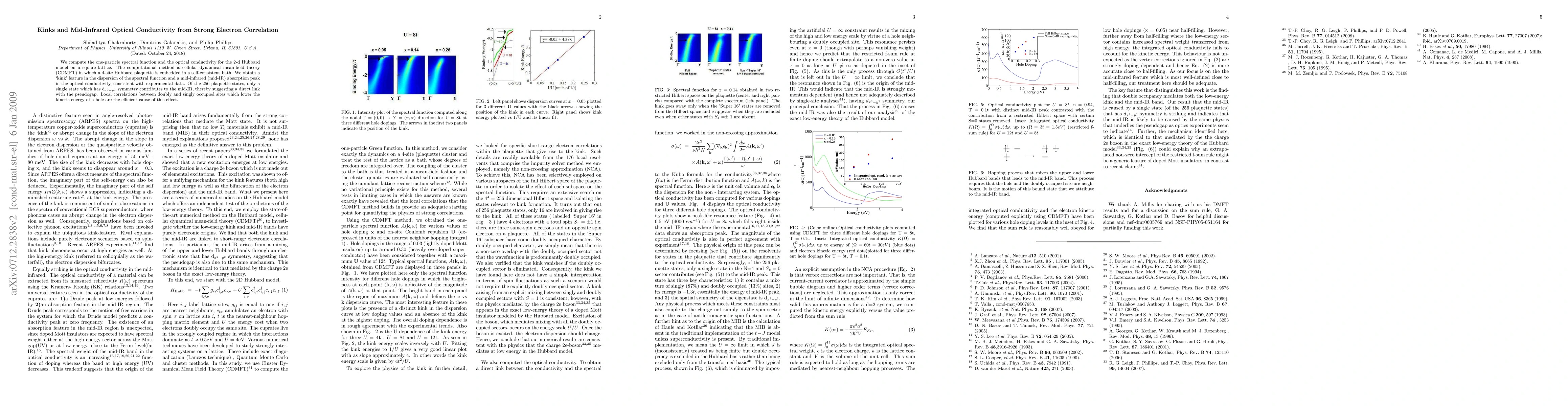 We compute the one-particle spectral function and the optical conductivity for the 2-d Hubbard model on a square lattice. The computational method is cellular dynamical mean-field theory (CDMFT) in which a 4-site Hubbard plaquette is embedded in a self-consistent bath. We obtain a `kink' feature in the dispersion of the spectral function and a mid-infrared (mid-IR) absorption peak in the optical conductivity, consistent with experimental data. Of the 256 plaquette states, only a single state which has d$_{x^2-y^2}$ symmetry contributes to the mid-IR, thereby suggesting a direct link with the pseudogap. Local correlations between doubly and singly occupied sites which lower the kinetic energy of a hole are the efficient cause of this effect.