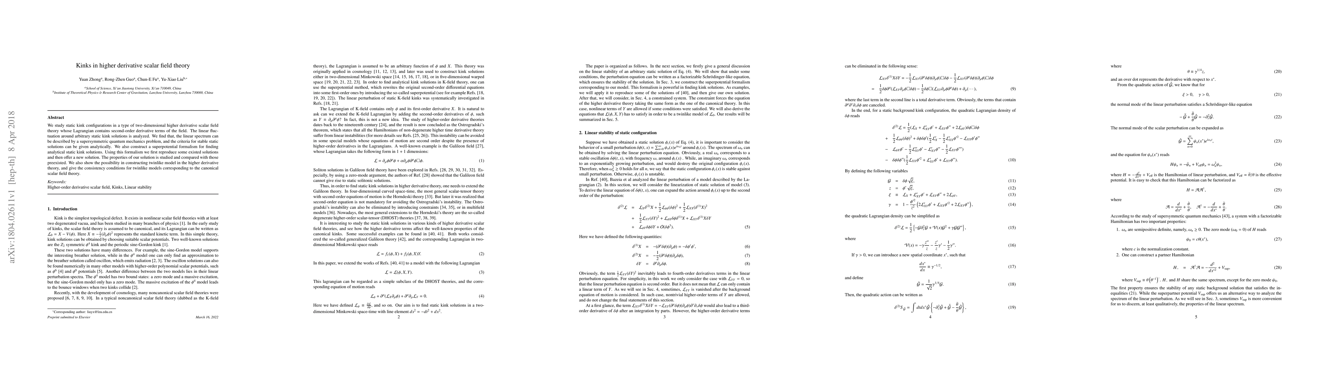 We study static kink configurations in a type of two-dimensional higher derivative scalar field theory whose Lagrangian contains second-order derivative terms of the field. The linear fluctuation around arbitrary static kink solutions is analyzed. We find that, the linear spectrum can be described by a supersymmetric quantum mechanics problem, and the criteria for stable static solutions can be given analytically. We also construct a superpotential formalism for finding analytical static kink solutions. Using this formalism we first reproduce some existed solutions and then offer a new solution. The properties of our solution is studied and compared without those preexisted. We also show the possibility in constructing twinlike model in the higher derivative theory, and give the consistency conditions for twinlike models corresponding to the canonical scalar field theory.