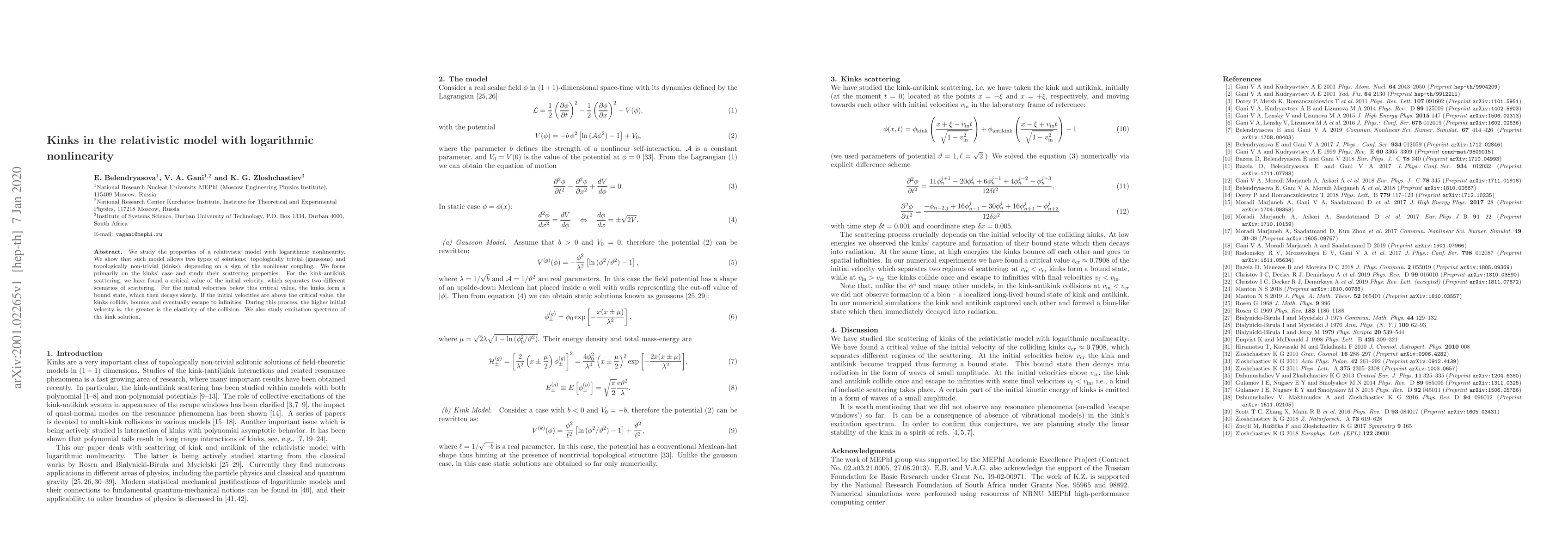 We study the properties of a relativistic model with logarithmic nonlinearity. We show that such model allows two types of solutions: topologically trivial (gaussons) and topologically non-trivial (kinks), depending on a sign of the nonlinear coupling. We focus primarily on the kinks' case and study their scattering properties. For the kink-antikink scattering, we have found a critical value of the initial velocity, which separates two different scenarios of scattering. For the initial velocities below this critical value, the kinks form a bound state, which then decays slowly. If the initial velocities are above the critical value, the kinks collide, bounce and eventually escape to infinities. During this process, the higher initial velocity is, the greater is the elasticity of the collision. We also study excitation spectrum of the kink solution.