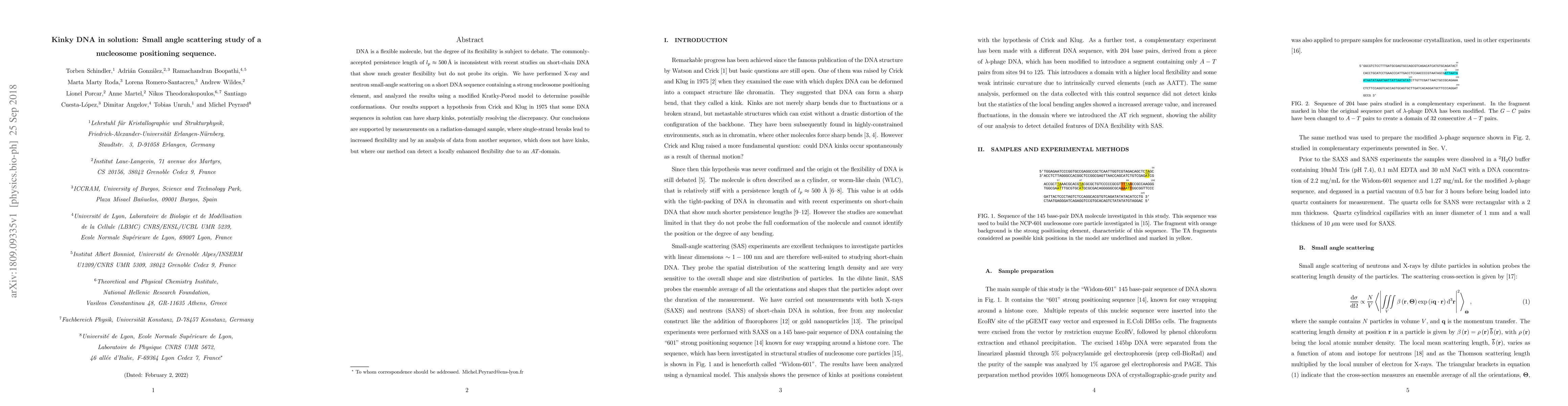 This study uses small-angle scattering to investigate the flexibility of a short DNA sequence with a nucleosome positioning element, revealing that certain sequences can form sharp kinks in solution, which may explain discrepancies in the persistence length of DNA. The findings support Crick and Klug's 1975 hypothesis and show that single-strand breaks increase flexibility, while an AT-domain enhances local flexibility without kinks.