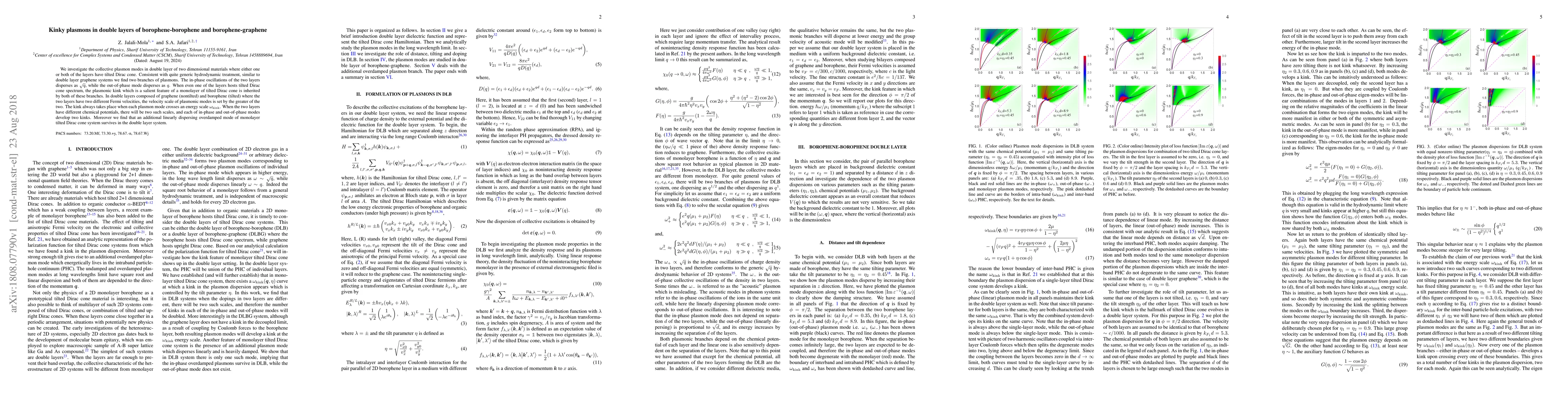 This paper explores collective plasmon modes in double layers of borophene-borophene and borophene-graphene, revealing two branches of plasmons with distinct dispersion behaviors. The study highlights kink features in plasmons arising from tilted Dirac cones, and identifies the velocity scale of plasmonic modes as determined by the greater Fermi velocity of the layers.