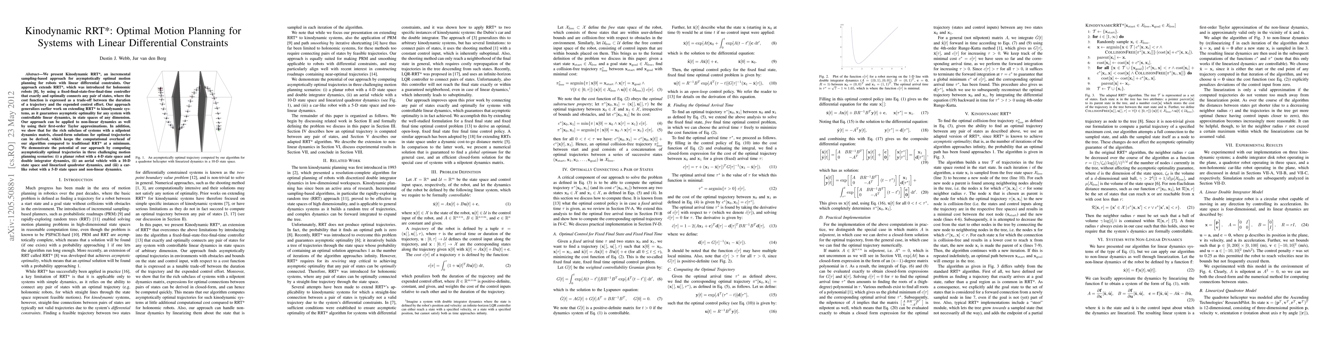 This paper introduces Kinodynamic RRT*, an optimal motion planning method for robots with linear differential constraints, extending RRT* to guarantee asymptotic optimality in any dimension. It also provides closed-form solutions for nilpotent dynamics, minimizing computational overhead.