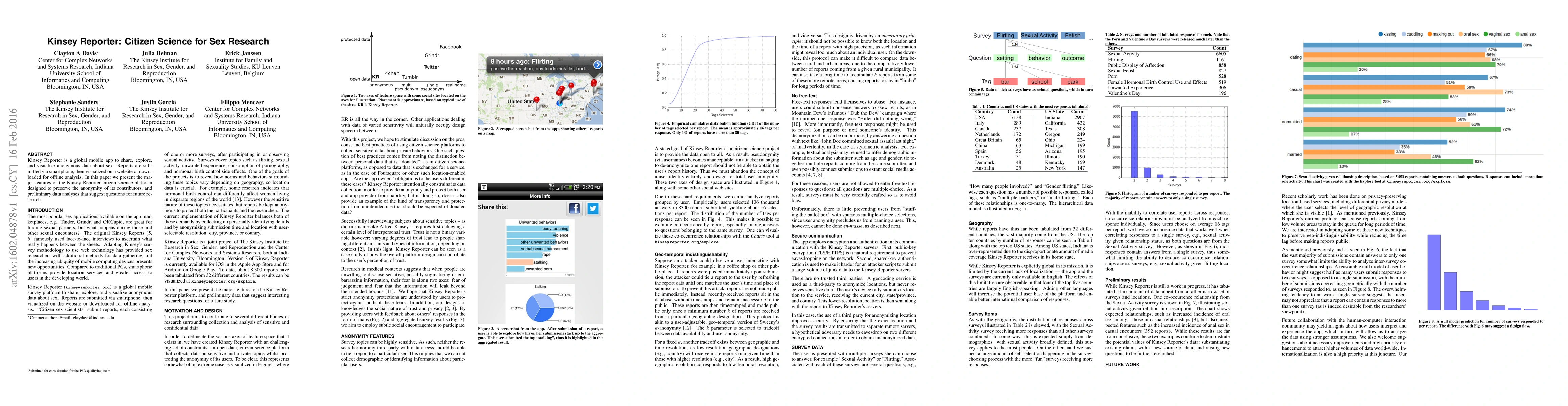 Kinsey Reporter is a global mobile app to share, explore, and visualize anonymous data about sex. Reports are submitted via smartphone, then visualized on a website or downloaded for offline analysis. In this paper we present the major features of the Kinsey Reporter citizen science platform designed to preserve the anonymity of its contributors, and preliminary data analyses that suggest questions for future research.