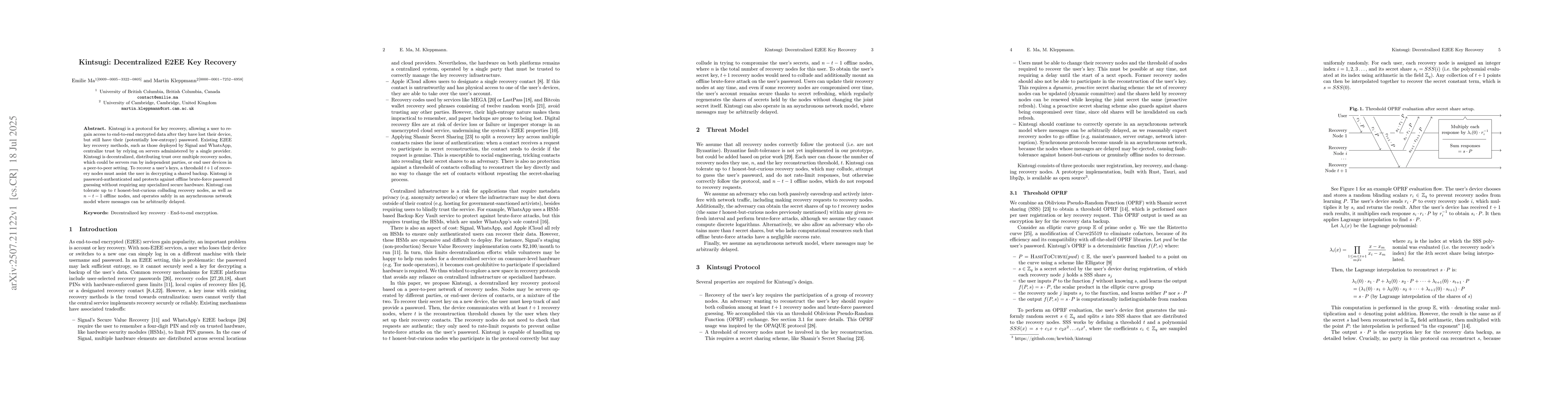 Kintsugi is a protocol for key recovery, allowing a user to regain access to end-to-end encrypted data after they have lost their device, but still have their (potentially low-entropy) password. Existing E2EE key recovery methods, such as those deployed by Signal and WhatsApp, centralize trust by relying on servers administered by a single provider. Kintsugi is decentralized, distributing trust over multiple recovery nodes, which could be servers run by independent parties, or end user devices in a peer-to-peer setting. To recover a user's keys, a threshold $t+1$ of recovery nodes must assist the user in decrypting a shared backup. Kintsugi is password-authenticated and protects against offline brute-force password guessing without requiring any specialized secure hardware. Kintsugi can tolerate up to $t$ honest-but-curious colluding recovery nodes, as well as $n - t - 1$ offline nodes, and operates safely in an asynchronous network model where messages can be arbitrarily delayed.