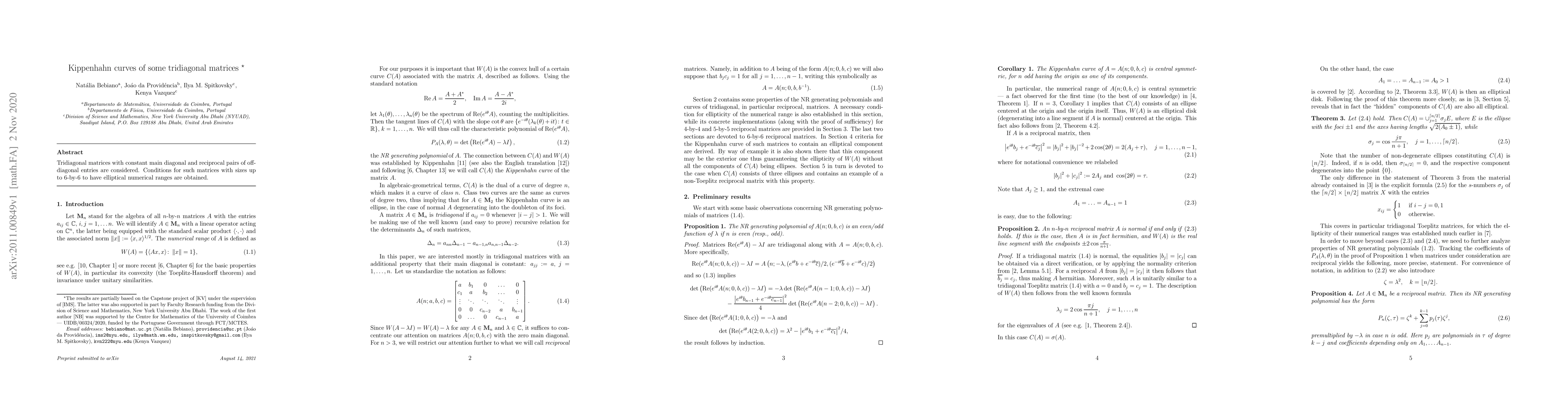 This paper investigates tridiagonal matrices with constant main diagonals and reciprocal off-diagonal entries, determining conditions for matrices up to 6x6 that yield elliptical numerical ranges, known as Kippenhahn curves. The findings provide insights into the numerical behavior of such matrices.