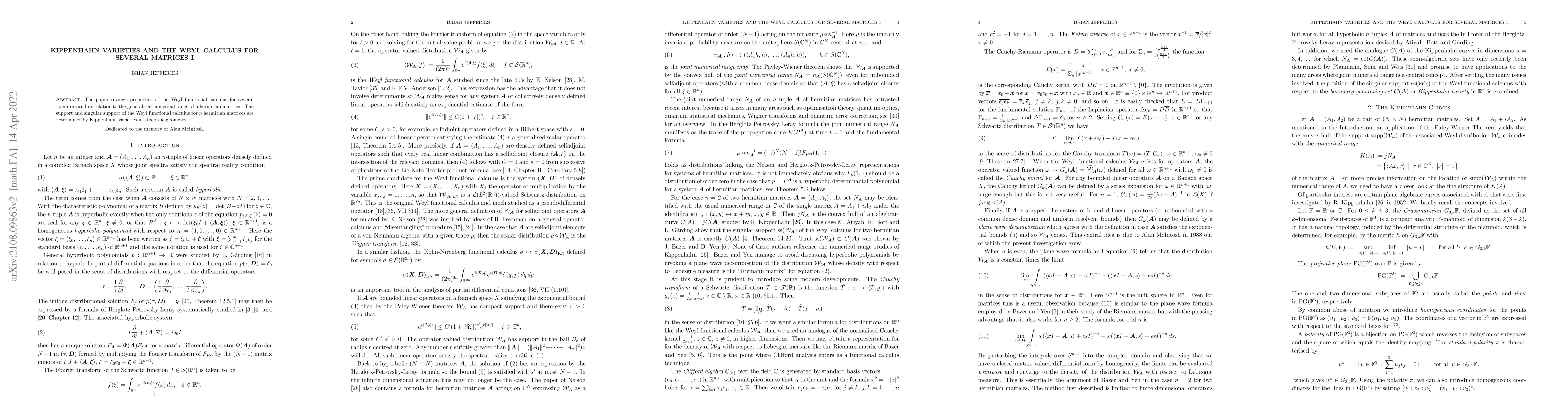 The paper reviews properties of the Weyl functional calculus for several operators and its relation to the generalised numerical range of $n$ hermitian matrices. The support and singular support of the Weyl functional calculus for $n$ hermitian matrices are determined by Kippenhahn varieties in algebraic geometry.