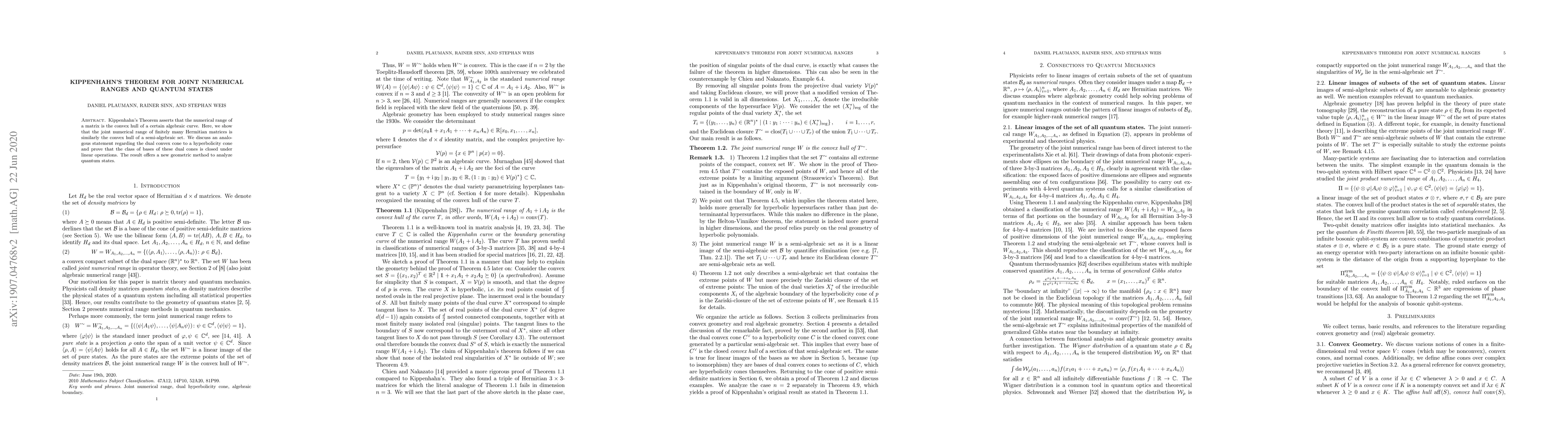 Kippenhahn's Theorem is extended to show that the joint numerical range of Hermitian matrices is the convex hull of a semi-algebraic set, providing a geometric approach to analyze quantum states and proving the class of dual cone bases is closed under linear operations.