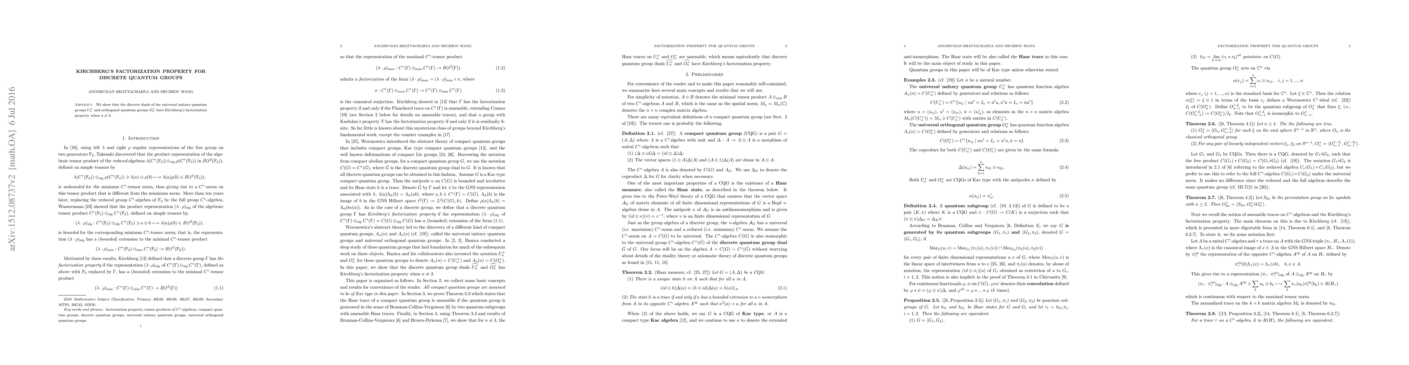 Summary: This paper demonstrates that the discrete duals of universal unitary and orthogonal quantum groups exhibit Kirchberg's factorization property, except when the dimension n equals 3. This finding extends the factorization property to discrete quantum groups under specific conditions.