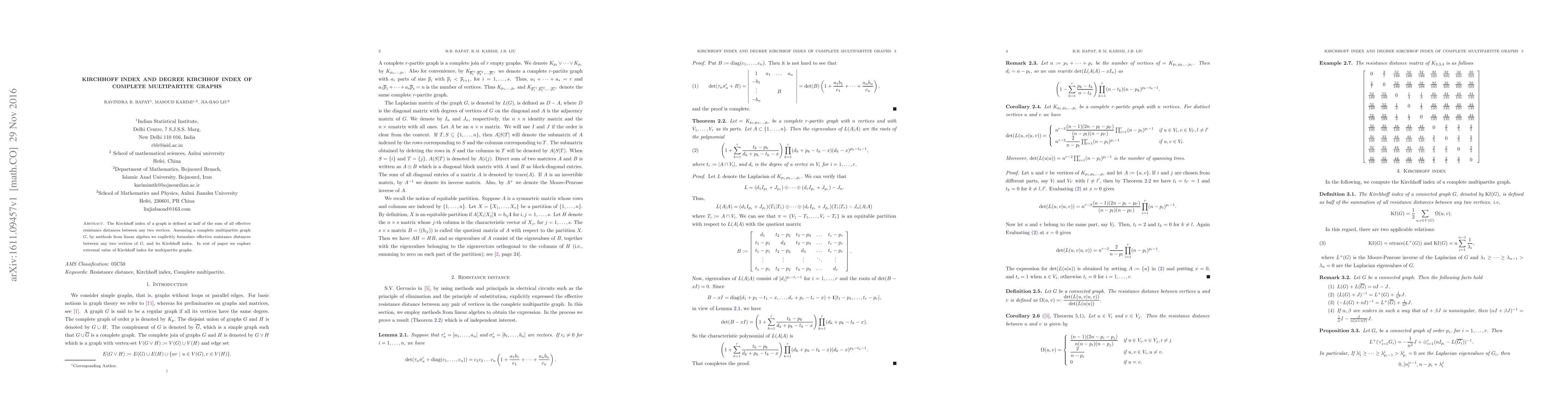 Summary: This paper derives the Kirchhoff index for complete multipartite graphs using linear algebra, and investigates the extremal value of this index for such graphs. The Kirchhoff index measures the sum of effective resistance distances between all pairs of vertices in a graph.