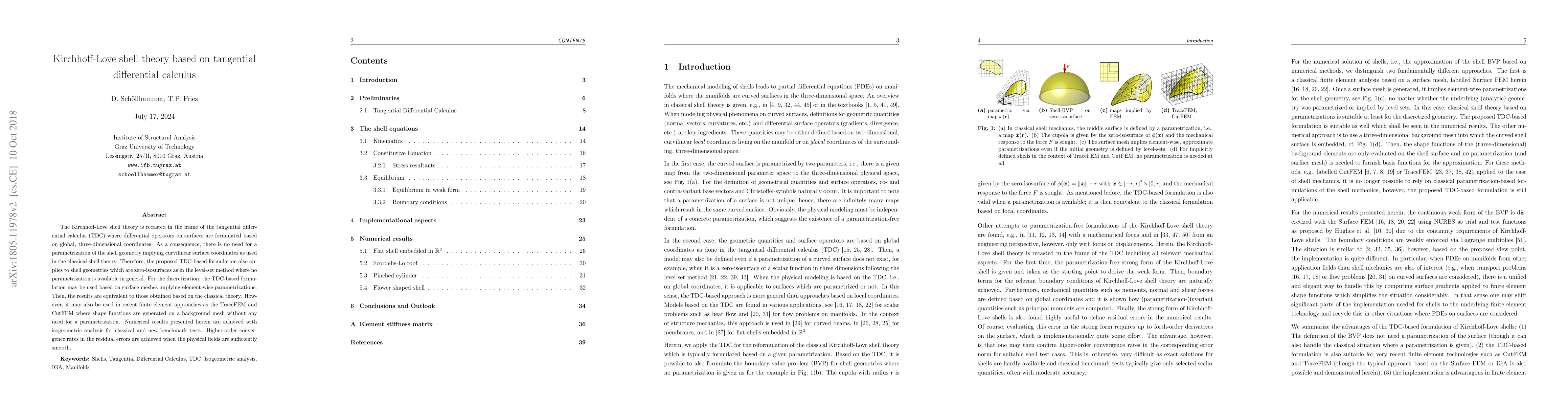 The paper introduces a novel formulation of Kirchhoff-Love shell theory using TDC, eliminating the need for surface parametrization and enabling the analysis of shell geometries defined by level-set methods.