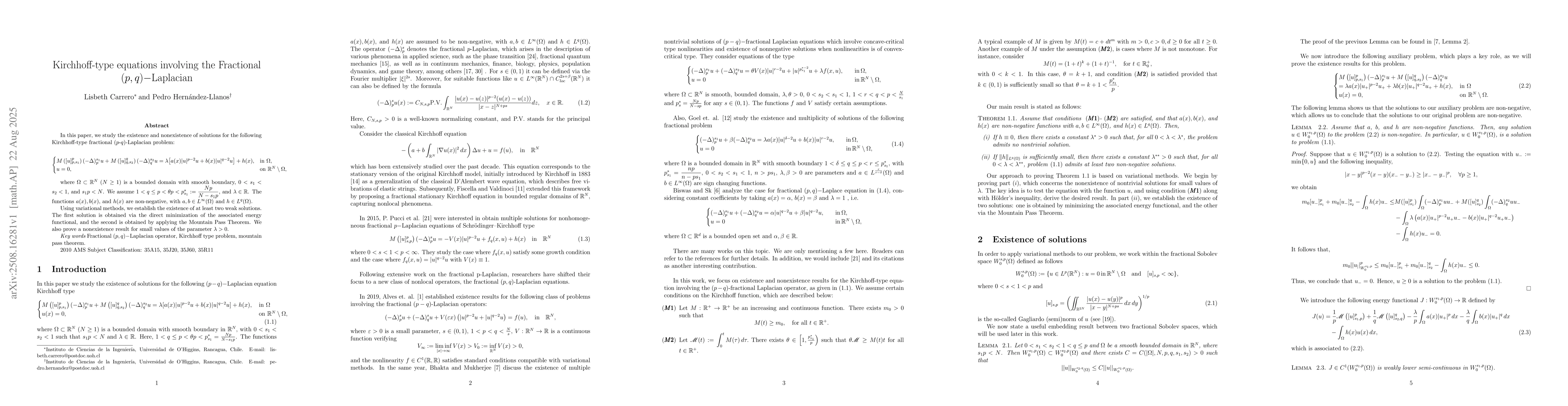 In this paper, we study the existence and nonexistence of solutions for the following Kirchhoff-type fractional $(p\text{-}q)$-Laplacian problem: \begin{equation*} \begin{cases} M\left([u]^p_{p,s_1}\right)(-\Delta)^{s_1}_p u + M\left([u]^q_{q,s_2}\right)(-\Delta)^{s_2}_q u = \lambda\big[a(x)|u|^{p-2}u + b(x)|u|^{q-2}u\big] + h(x), & \text{in } \Omega, \\ u = 0, & \text{on } \mathbb{R}^N \setminus \Omega, \end{cases} \end{equation*} where $\Omega \subset \mathbb{R}^N$ ($N \geq 1$) is a bounded domain with smooth boundary, $0 < s_1 < s_2 < 1$, and $s_1 p < N$. We assume $1 < q \leq p < \theta p < p^{*}_{s_1} := \dfrac{Np}{N - s_1 p}$, and $\lambda \in \mathbb{R}$. The functions $a(x), b(x)$, and $h(x)$ are non-negative, with $a, b \in L^\infty(\Omega)$ and $h \in L^q(\Omega)$. Using variational methods, we establish the existence of at least two weak solutions. The first solution is obtained via the direct minimization of the associated energy functional, and the second is obtained by applying the Mountain Pass Theorem. We also prove a nonexistence result for small values of the parameter $\lambda > 0$.