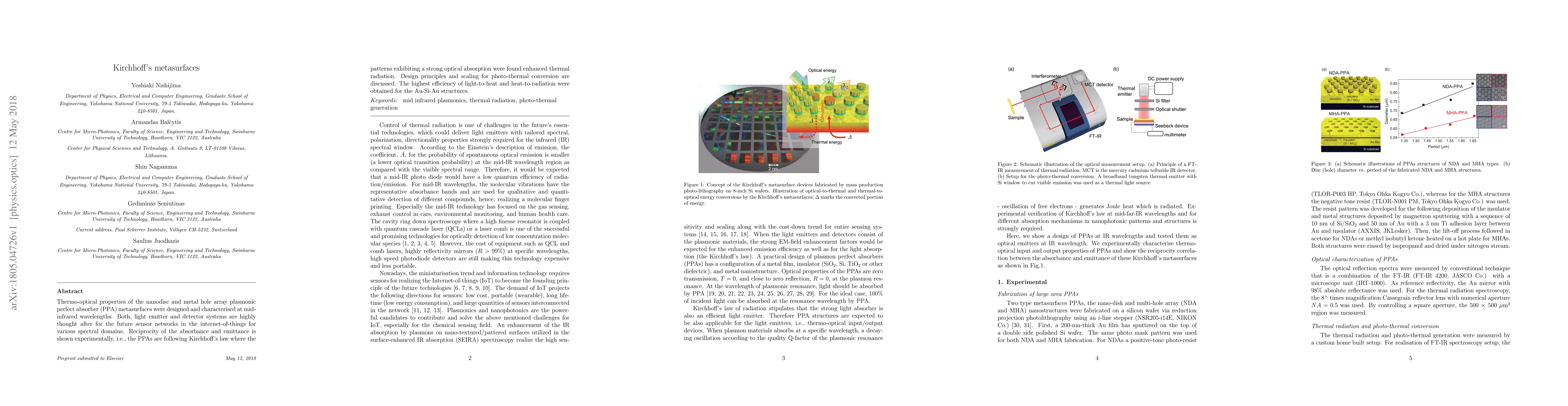 Thermo-optical properties of the nanodisc and metal hole array plasmonic perfect absorber (PPA) metasurfaces were designed and characterised at midinfrared wavelengths. Both, light emitter and detector systems are highly thought after for the future sensor networks in the internet-of-things for various spectral domains. Reciprocity of the absorbance and emittance is shown experimentally, i.e., the PPAs are following Kirchhoff's law where the patterns exhibiting a strong optical absorption were found enhanced thermal radiation. Design principles and scaling for photo-thermal conversion are discussed. The highest efficiency of light-to-heat and heat-to-radiation were obtained for the Au-Si-Au structures.