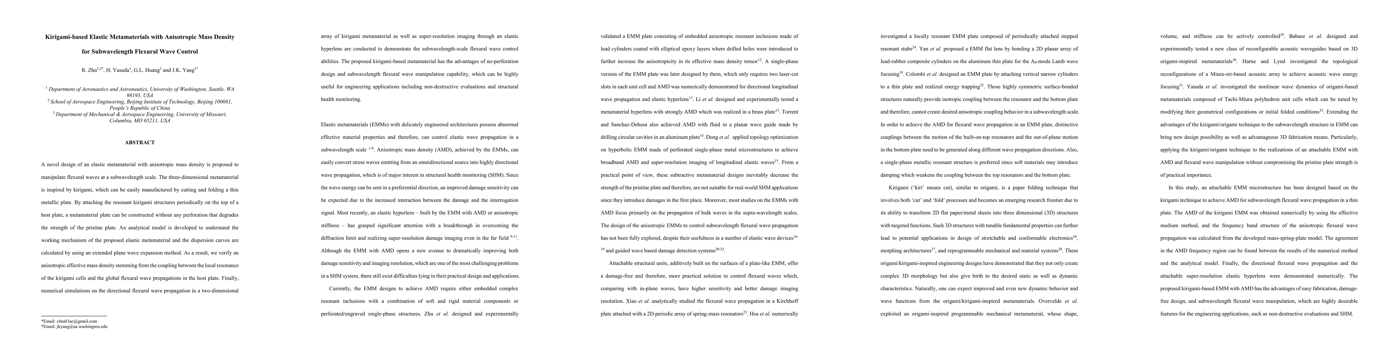 This paper proposes a novel kirigami-based elastic metamaterial with anisotropic mass density to control subwavelength flexural waves. The design, inspired by kirigami, involves cutting and folding a thin metallic plate without perforating it, thus maintaining structural integrity.
