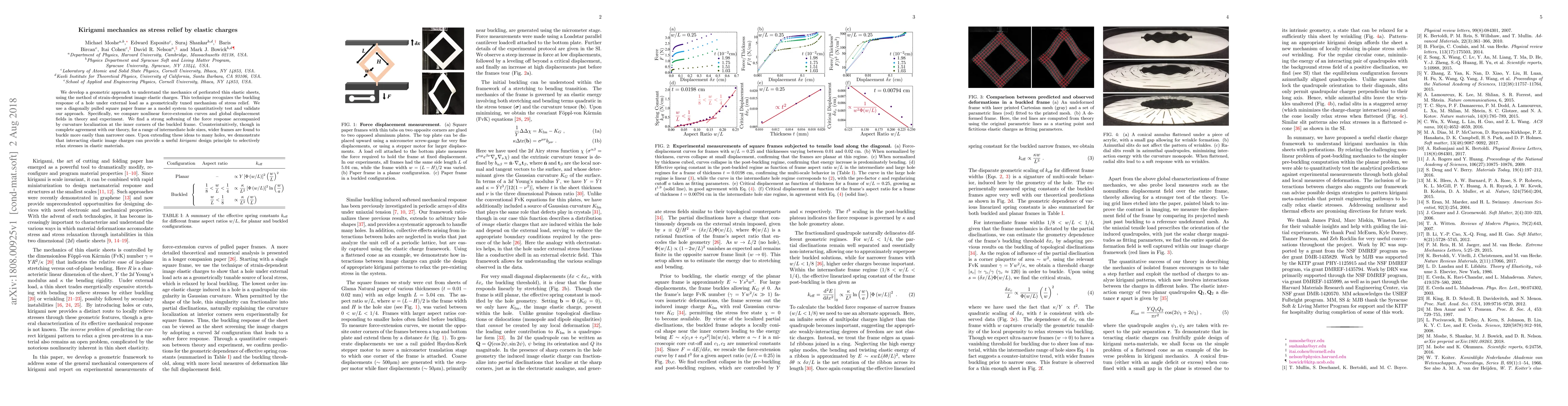 We develop a geometric approach to understand the mechanics of perforated thin elastic sheets, using the method of strain-dependent image elastic charges. This technique recognizes the buckling response of a hole under external load as a geometrically tuned mechanism of stress relief. We use a diagonally pulled square paper frame as a model system to quantitatively test and validate our approach. Specifically, we compare nonlinear force-extension curves and global displacement fields in theory and experiment. We find a strong softening of the force response accompanied by curvature localization at the inner corners of the buckled frame. Counterintuitively, though in complete agreement with our theory, for a range of intermediate hole sizes, wider frames are found to buckle more easily than narrower ones. Upon extending these ideas to many holes, we demonstrate that interacting elastic image charges can provide a useful kirigami design principle to selectively relax stresses in elastic materials.