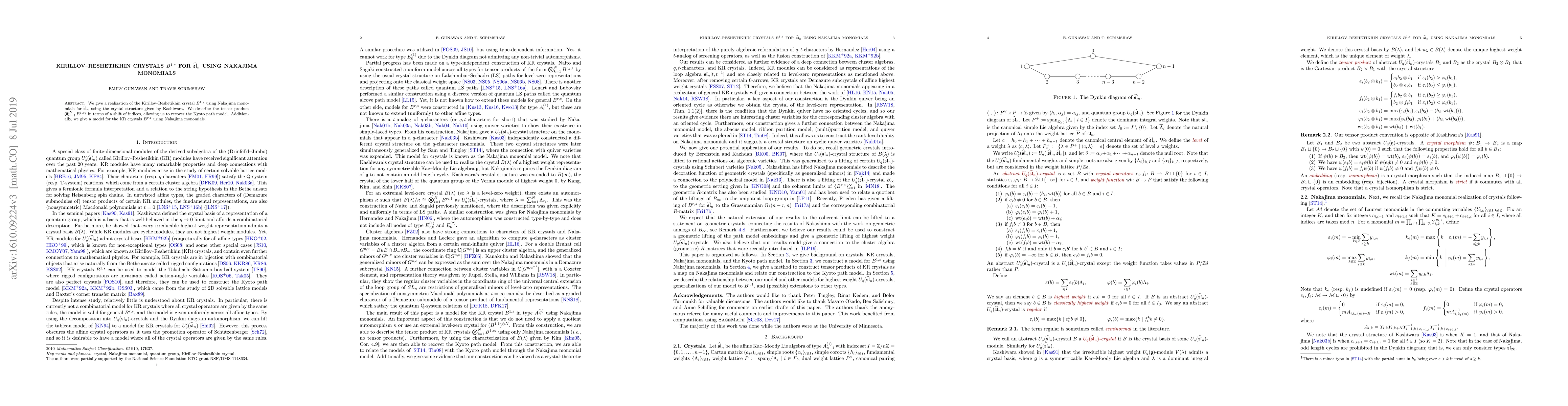 We give a realization of the Kirillov--Reshetikhin crystal $B^{1,s}$ using Nakajima monomials for $\widehat{\mathfrak{sl}}_n$ using the crystal structure given by Kashiwara. We describe the tensor product $\bigotimes_{i=1}^N B^{1,s_i}$ in terms of a shift of indices, allowing us to recover the Kyoto path model. Additionally, we give a model for the KR crystals $B^{r,1}$ using Nakajima monomials.