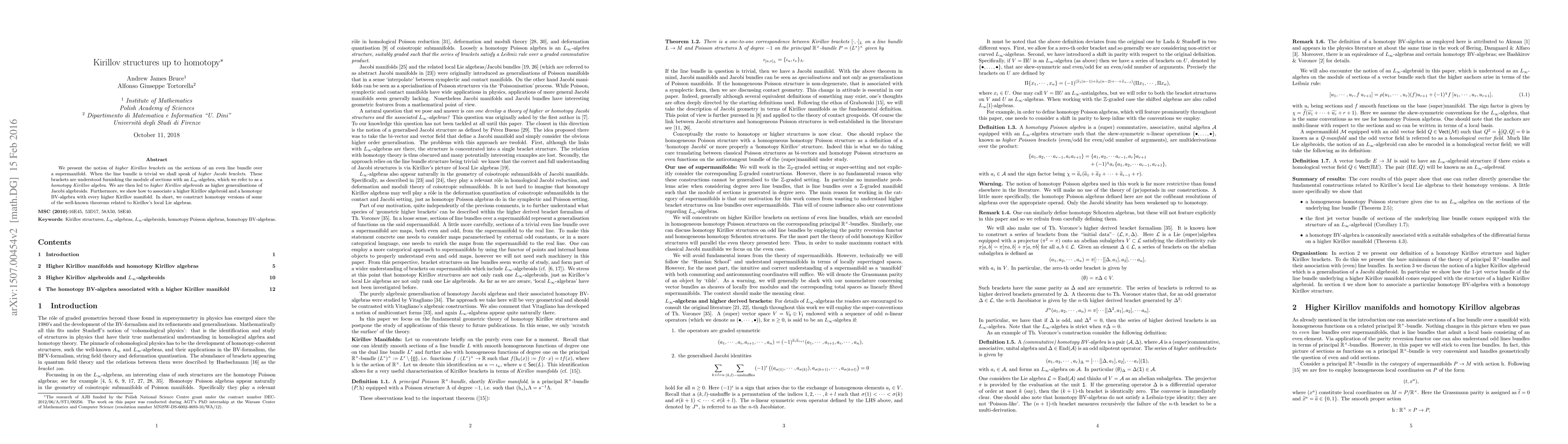 We present the notion of higher Kirillov brackets on the sections of an even line bundle over a supermanifold. When the line bundle is trivial we shall speak of higher Jacobi brackets. These brackets are understood furnishing the module of sections with an $L_{\infty}$-algebra, which we refer to as a homotopy Kirillov algebra. We are then to higher Kirillov algebroids as higher generalisations of Jacobi algebroids. Furthermore, we show how to associate a higher Kirillov algebroid and a homotopy BV-algebra with every higher Kirillov manifold. In short, we construct homotopy versions of some of the well-known theorems related to Kirillov's local Lie algebras.