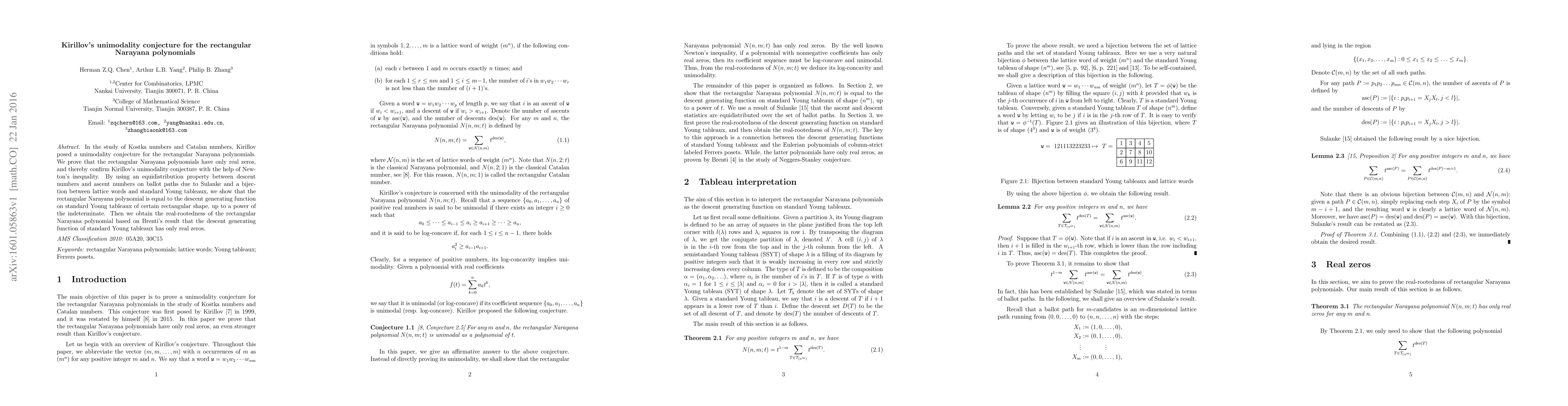 This paper confirms Kirillov's unimodality conjecture for rectangular Narayana polynomials by proving their real-rootedness. The authors leverage Newton's inequality, Sulanke's equidistribution property, and a bijection between lattice words and standard Young tableaux to demonstrate that these polynomials are equivalent to descent generating functions on certain tableaux.