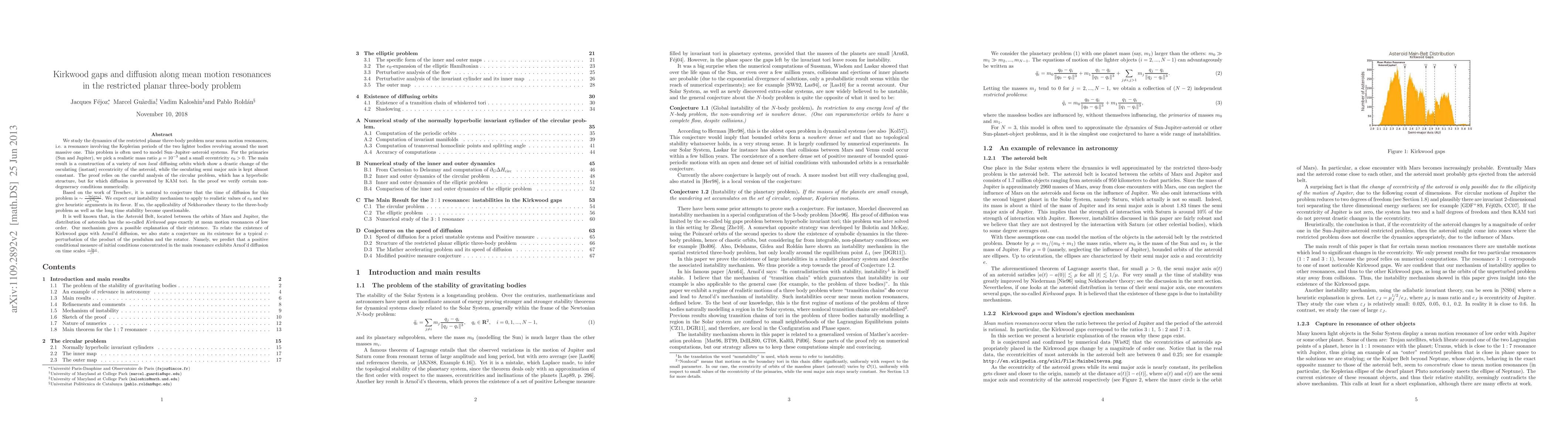 This research examines the dynamics near mean motion resonances in the restricted three-body problem, revealing non-local diffusing orbits that drastically change asteroid eccentricity while keeping the semi-major axis nearly constant. The study suggests a diffusion time scaling and conjectures a link between Kirkwood gaps in the Asteroid Belt and Arnold diffusion, challenging current theories on long-term stability.