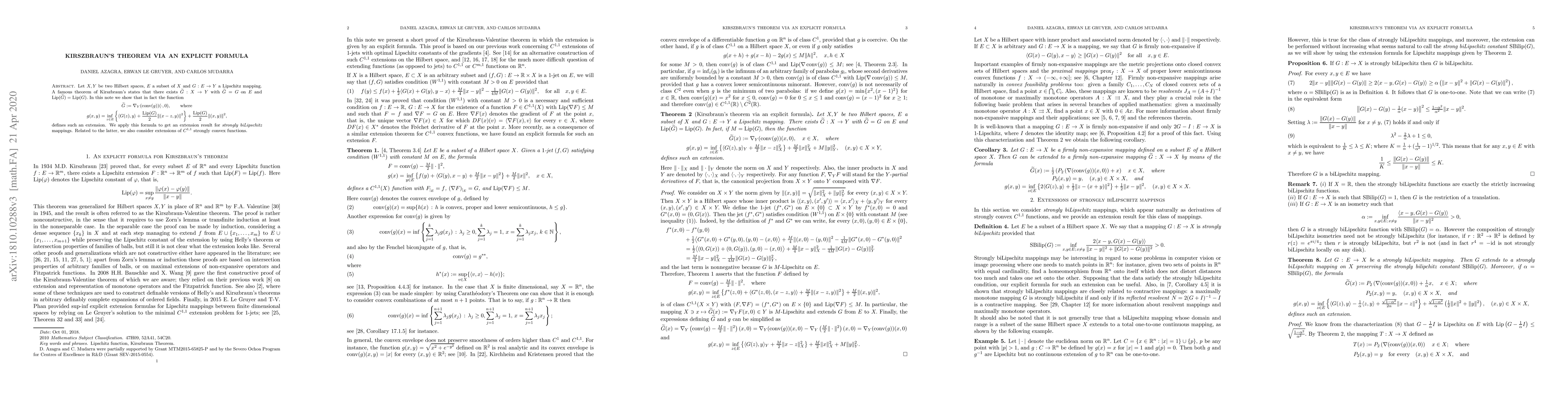 This paper presents an explicit formula for extending a Lipschitz mapping \(G: E \to Y\) from a subset \(E\) of Hilbert space \(X\) to the whole space \(X\) while preserving the Lipschitz constant, based on Kirszbraun's theorem. The extension is achieved using a specific construction involving the convex hull and gradient in \(Y\), and the method is applied to strongly biLipschitz homeomorphisms and \(C^{1,1}\) strongly convex functions.