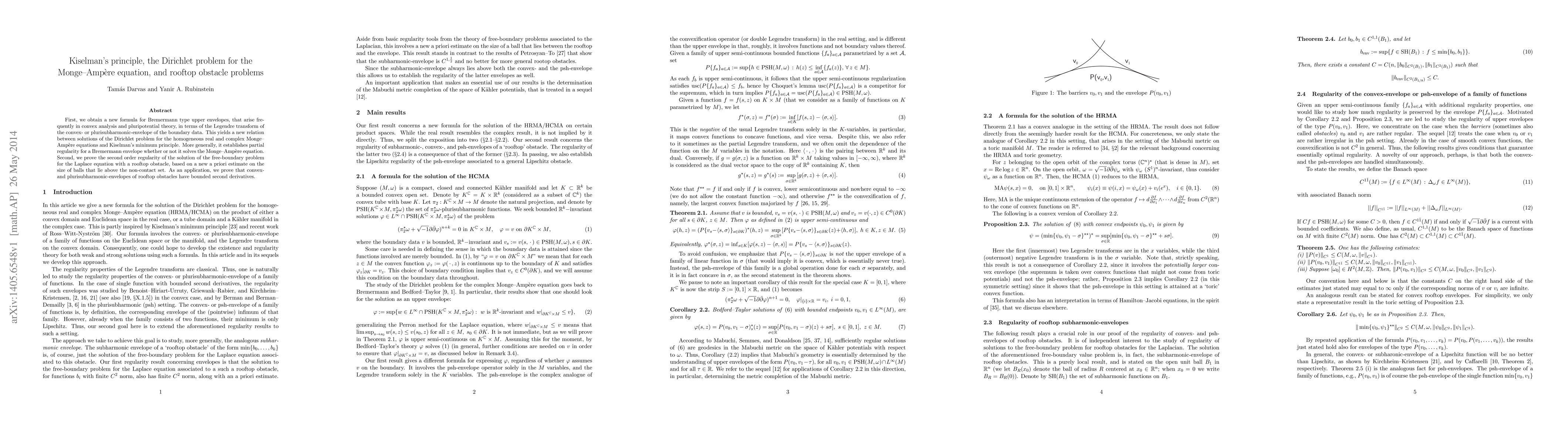 This paper establishes a new relationship between solutions of the Dirichlet problem for the Monge-Ampere equations and Kiselman's principle, and proves second-order regularity for solutions to the Laplace equation with a rooftop obstacle, showing bounded second derivatives for convex- and plurisubharmonic-envelopes of such obstacles.