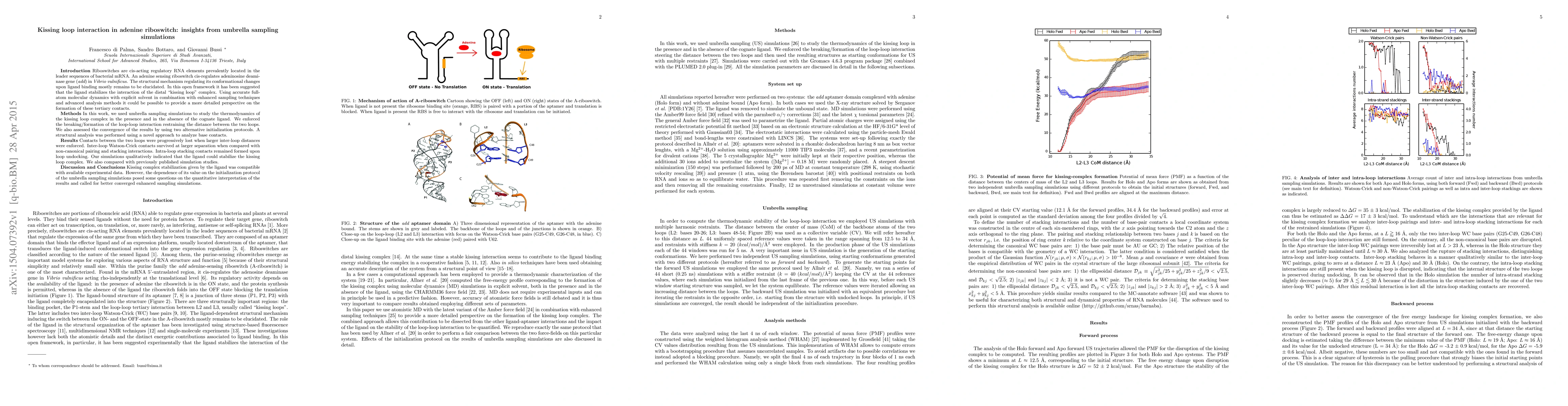 Riboswitches are cis-acting regulatory RNA elements prevalently located in the leader sequences of bacterial mRNA. An adenine sensing riboswitch cis-regulates adeninosine deaminase gene (add) in Vibrio vulnificus. The structural mechanism regulating its conformational changes upon ligand binding mostly remains to be elucidated. In this open framework it has been suggested that the ligand stabilizes the interaction of the distal "kissing loop" complex. Using accurate full-atom molecular dynamics with explicit solvent in combination with enhanced sampling techniques and advanced analysis methods it could be possible to provide a more detailed perspective on the formation of these tertiary contacts. In this work, we used umbrella sampling simulations to study the thermodynamics of the kissing loop complex in the presence and in the absence of the cognate ligand. We enforced the breaking/formation of the loop-loop interaction restraining the distance between the two loops. We also assessed the convergence of the results by using two alternative initialization protocols. A structural analysis was performed using a novel approach to analyze base contacts. Our simulations qualitatively indicated that the ligand could stabilize the kissing loop complex. We also compared with previously published simulation studies. Kissing complex stabilization given by the ligand was compatible with available experimental data. However, the dependence of its value on the initialization protocol of the umbrella sampling simulations posed some questions on the quantitative interpretation of the results and called for better converged enhanced sampling simulations.