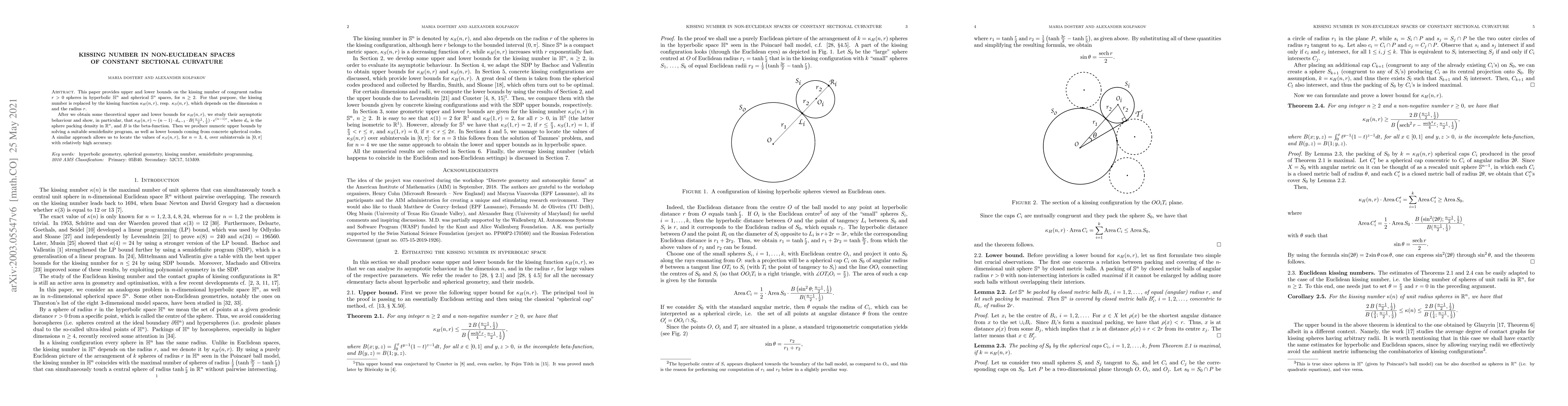 This paper provides upper and lower bounds on the kissing number of congruent radius $r > 0$ spheres in hyperbolic $\mathbb{H}^n$ and spherical $\mathbb{S}^n$ spaces, for $n\geq 2$. For that purpose, the kissing number is replaced by the kissing function $\kappa_H(n, r)$, resp. $\kappa_S(n, r)$, which depends on the dimension $n$ and the radius $r$. After we obtain some theoretical upper and lower bounds for $\kappa_H(n, r)$, we study their asymptotic behaviour and show, in particular, that $\kappa_H(n,r) \sim (n-1) \cdot d_{n-1} \cdot B(\frac{n-1}{2}, \frac{1}{2}) \cdot e^{(n-1) r}$, where $d_n$ is the sphere packing density in $\mathbb{R}^n$, and $B$ is the beta-function. Then we produce numeric upper bounds by solving a suitable semidefinite program, as well as lower bounds coming from concrete spherical codes. A similar approach allows us to locate the values of $\kappa_S(n, r)$, for $n= 3,\, 4$, over subintervals in $[0, \pi]$ with relatively high accuracy.