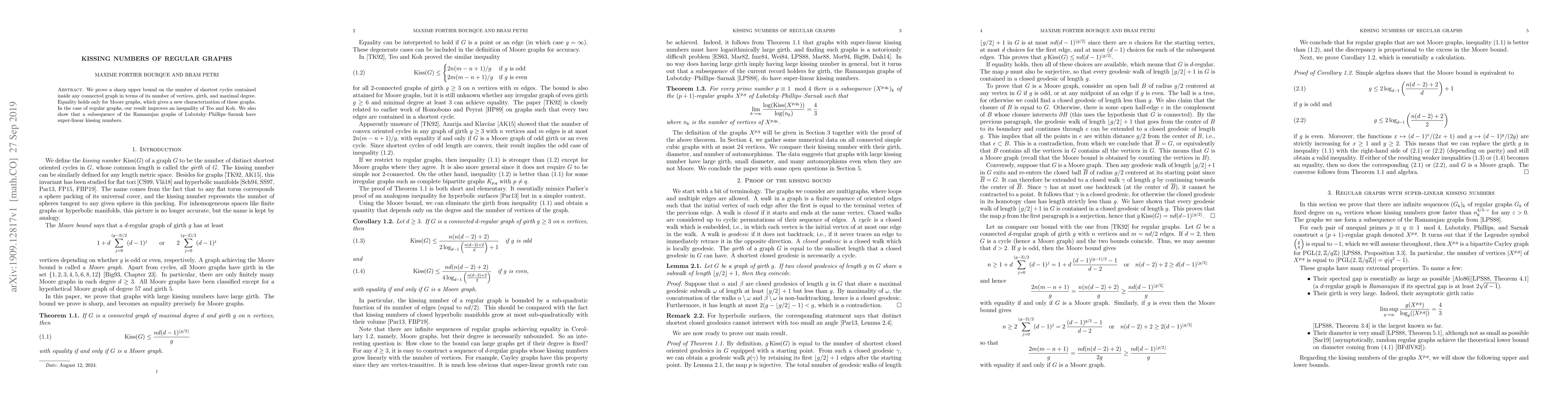 We prove a sharp upper bound on the number of shortest cycles contained inside any connected graph in terms of its number of vertices, girth, and maximal degree. Equality holds only for Moore graphs, which gives a new characterization of these graphs. In the case of regular graphs, our result improves an inequality of Teo and Koh. We also show that a subsequence of the Ramanujan graphs of Lubotzky-Phillips-Sarnak have super-linear kissing numbers.