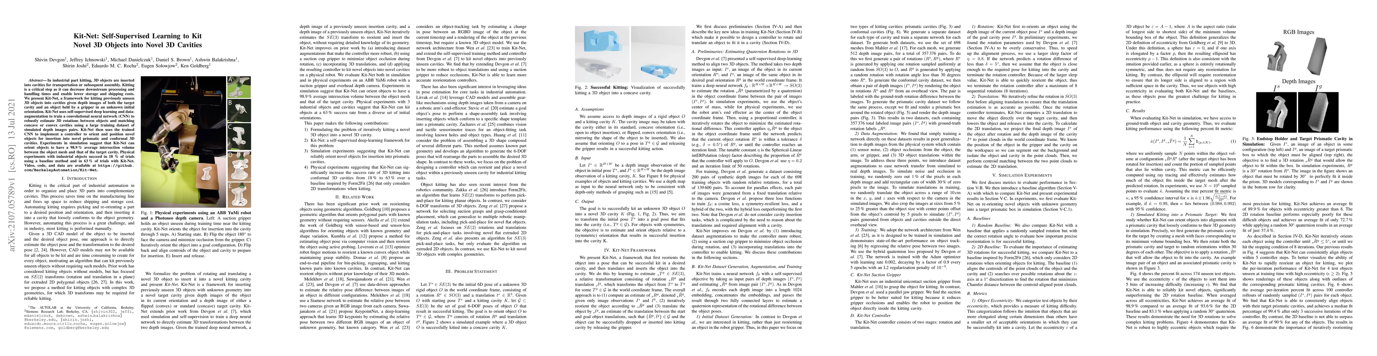 Kit-Net is a self-supervised learning framework designed to automate the process of inserting novel 3D objects into cavities, which is crucial for efficient industrial part kitting. The system leverages depth images and deep learning to estimate object rotations and positions, achieving high accuracy in simulations and improved success rates in physical experiments. For more details, please visit the project repository at https://github.com/BerkeleyAutomation/Kit-Net.