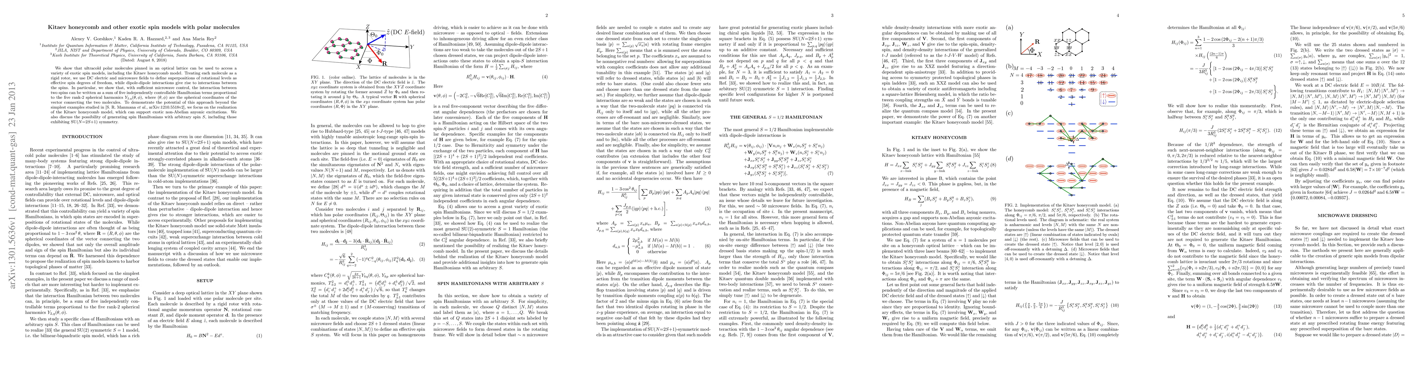 This paper demonstrates how ultracold polar molecules in an optical lattice can emulate exotic spin models such as the Kitaev honeycomb model, utilizing electric and microwave fields to manipulate molecular rotational states and dipole-dipole interactions to control spin interactions. The study highlights the potential for creating complex spin Hamiltonians with non-Abelian anyonic excitations.