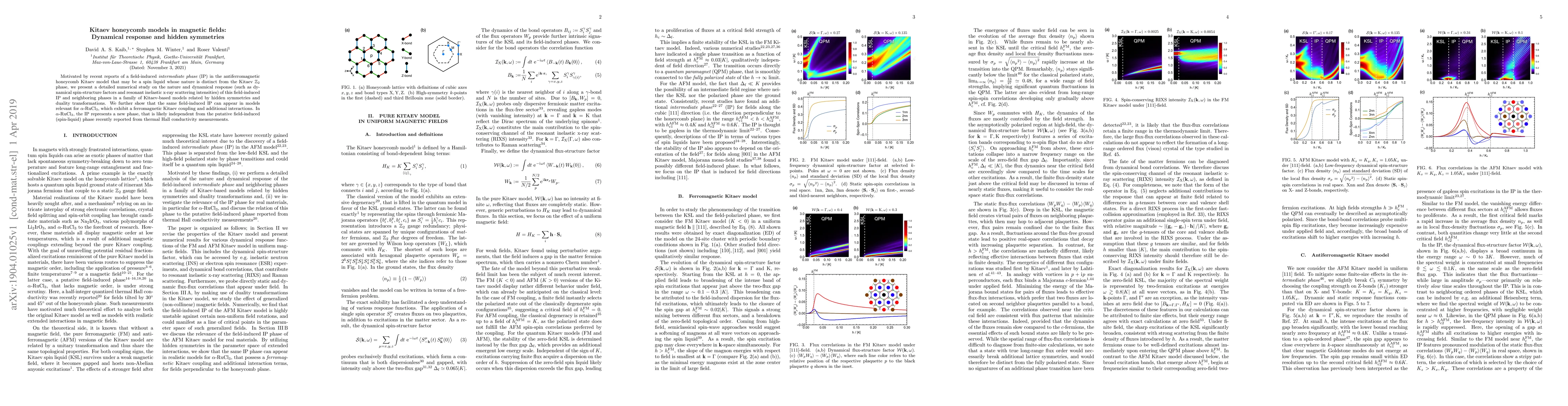 Motivated by recent reports of a field-induced intermediate phase (IP) in the antiferromagnetic honeycomb Kitaev model that may be a spin liquid whose nature is distinct from the Kitaev Z2 phase, we present a detailed numerical study on the nature and dynamical response (such as dynamical spin-structure factors and resonant inelastic x-ray scattering intensities) of this field-induced IP and neighboring phases in a family of Kitaev-based models related by hidden symmetries and duality transformations. We further show that the same field-induced IP can appear in models relevant for $\alpha$-RuCl${_3}$, which exhibit a ferromagnetic Kitaev coupling and additional interactions. In $\alpha$-RuCl${_3}$, the IP represents a new phase, that is likely independent from the putative field-induced (spin-liquid) phase recently reported from thermal Hall conductivity measurements.