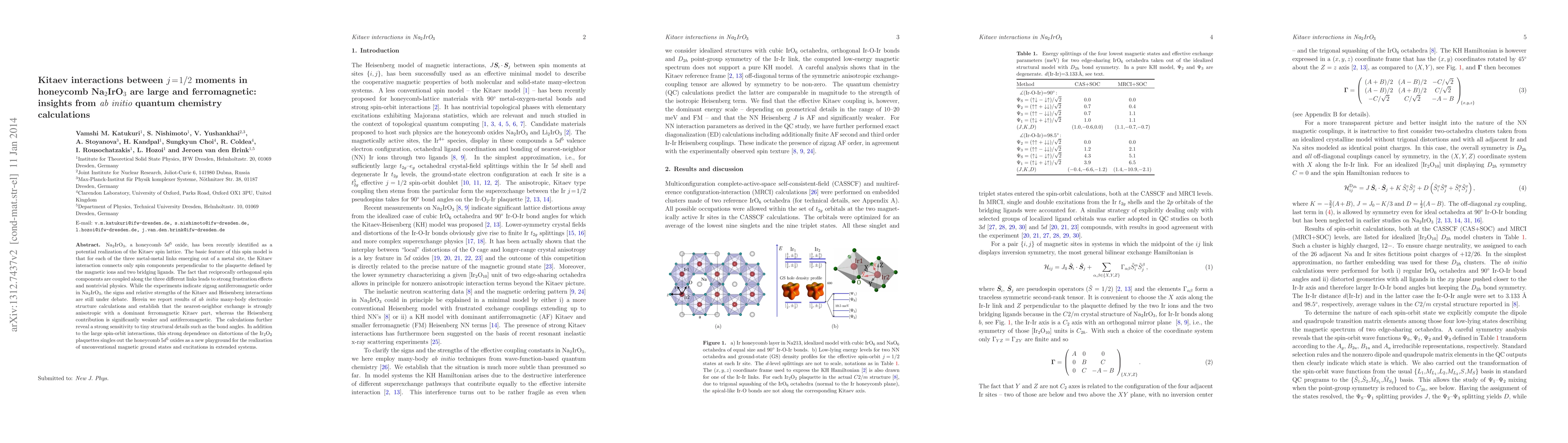 This paper reports ab initio quantum chemistry calculations revealing that in Na$_2$IrO$_3$, the Kitaev interactions between j=1/2 moments on the honeycomb lattice are large and predominantly ferromagnetic, while the Heisenberg interactions are weaker and antiferromagnetic. The study highlights the material's potential for unconventional magnetic states due to its strong spin-orbit coupling and sensitivity to structural details.