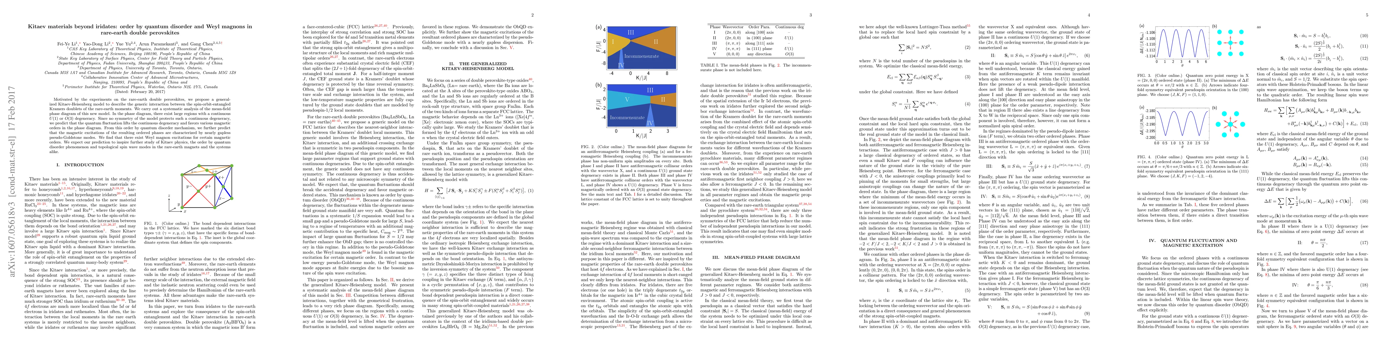 Motivated by the experiments on the rare-earth double perovskites, we propose a generalized Kitaev-Heisenberg model to describe the generic interaction between the spin-orbit-entangled Kramers' doublets of the rare-earth moments. We carry out a systematic analysis of the mean-field phase diagram of this new model. In the phase diagram, there exist large regions with a continuous U(1) or O(3) degeneracy. Since no symmetry of the model protects such a continuous degeneracy, we predict that the quantum fluctuation lifts the continuous degeneracy and favors various magnetic orders in the phase diagram. From this order by quantum disorder mechanism, we further predict that the magnetic excitations of the resulting ordered phases are characterized by nearly gapless pseudo-Goldstone modes. We find that there exist Weyl magnon excitations for certain magnetic orders. We expect our prediction to inspire further study of Kitaev physics, the order by quantum disorder phenomenon and topological spin wave modes in the rare-earth magnets and the systems alike.