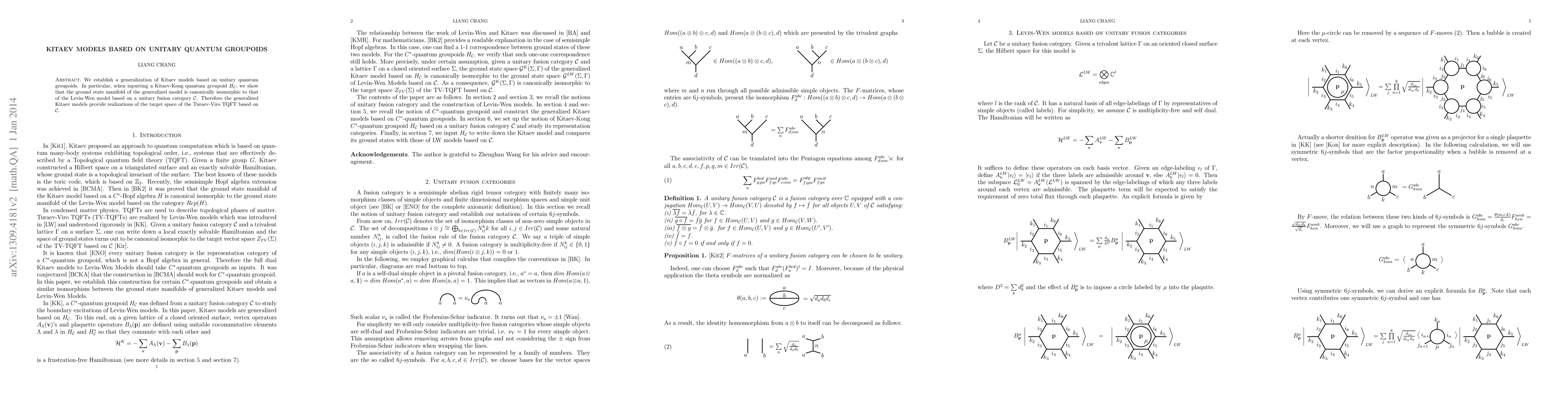 We establish a generalization of Kitaev models based on unitary quantum groupoids. In particular, when inputting a Kitaev-Kong quantum groupoid $H_\mathcal{C}$, we show that the ground state manifold of the generalized model is canonical isomorphic to that of the Levin-Wen model based on a unitary fusion category $\mathcal{C}$. Therefore the generalized Kitaev models provide realizations of the target space of the Turaev-Viro TQFT based on $\mathcal{C}$.