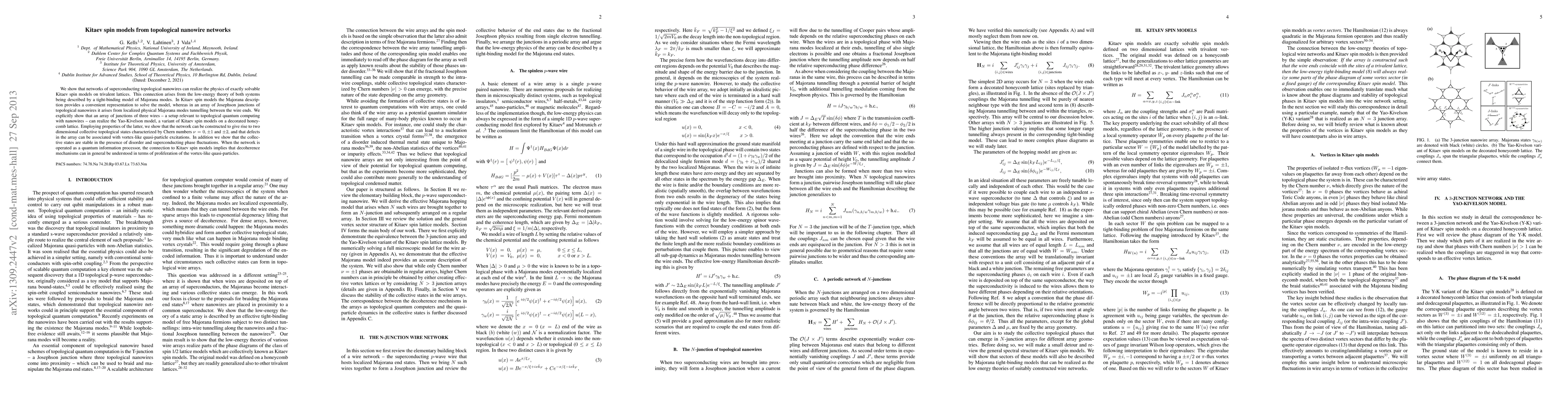 We show that networks of topological nanowires can realize the physics of exactly solvable Kitaev spin models with two-body interactions. This connection arises from the description of the low-energy theory of both systems in terms of a tight-binding model of Majorana modes. In Kitaev spin models the Majorana description provides a convenient representation to solve the model, whereas in an array of topological nanowires it arises, because the physical Majorana modes localized at wire ends permit tunnelling between wire ends and across different Josephson junctions. We explicitly show that an array of junctions of three wires -- a setup relevant to topological quantum computing with nanowires -- can realize the Yao-Kivelson model, a variant of Kitaev spin models on a decorated honeycomb lattice. Translating the results from the latter, we show that the network can be constructed to give rise to collective states characterized by Chern numbers \nu = 0, +/-1 and +/-2, and that defects in an array can be associated with vortex-like quasi-particle excitations. Finally, we analyze the stability of the collective states as well as that of the network as a quantum information processor. We show that decoherence inducing instabilities, be them due to disorder or phase fluctuations, can be understood in terms of proliferation of the vortex-like quasi-particles.