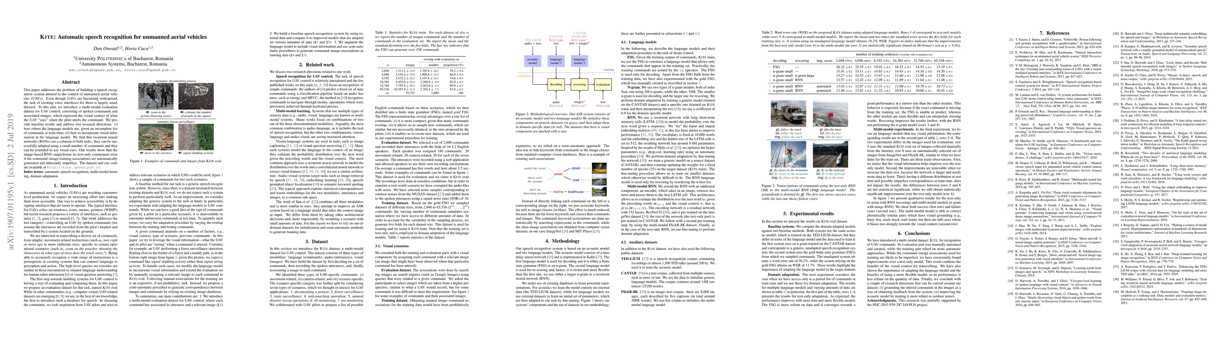 This paper addresses the problem of building a speech recognition system attuned to the control of unmanned aerial vehicles (UAVs). Even though UAVs are becoming widespread, the task of creating voice interfaces for them is largely unaddressed. To this end, we introduce a multi-modal evaluation dataset for UAV control, consisting of spoken commands and associated images, which represent the visual context of what the UAV "sees" when the pilot utters the command. We provide baseline results and address two research directions: (i) how robust the language models are, given an incomplete list of commands at train time; (ii) how to incorporate visual information in the language model. We find that recurrent neural networks (RNNs) are a solution to both tasks: they can be successfully adapted using a small number of commands and they can be extended to use visual cues. Our results show that the image-based RNN outperforms its text-only counterpart even if the command-image training associations are automatically generated and inherently imperfect. The dataset and our code are available at http://kite.speed.pub.ro.