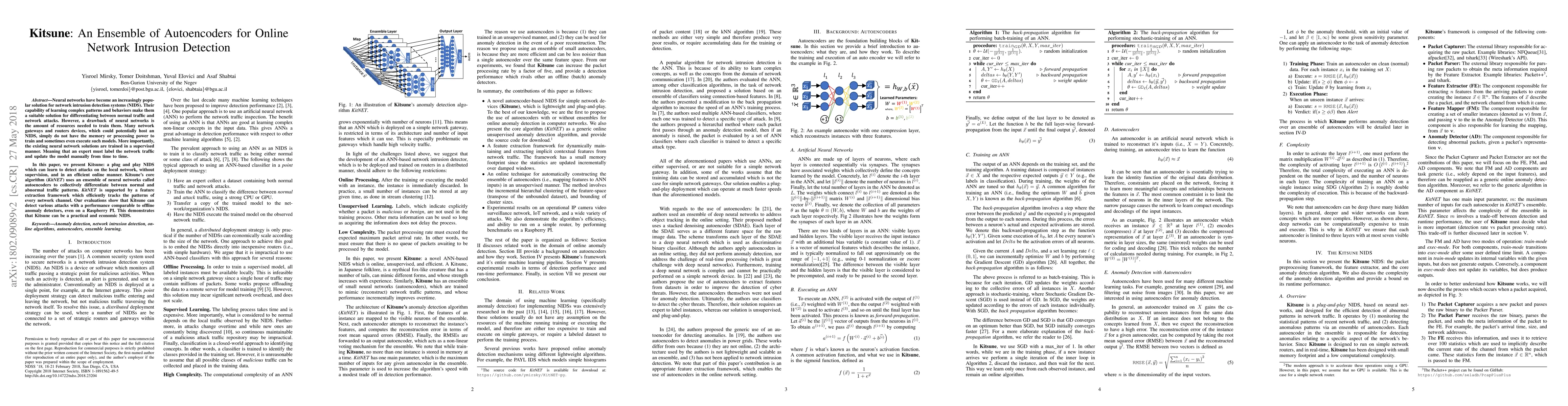 Kitsune is a lightweight, unsupervised, and online network intrusion detection system (NIDS) using autoencoder ensembles, called KitNET. It efficiently detects various attacks on local networks, even on low-resource devices like Raspberry PI, with performance comparable to offline anomaly detectors.