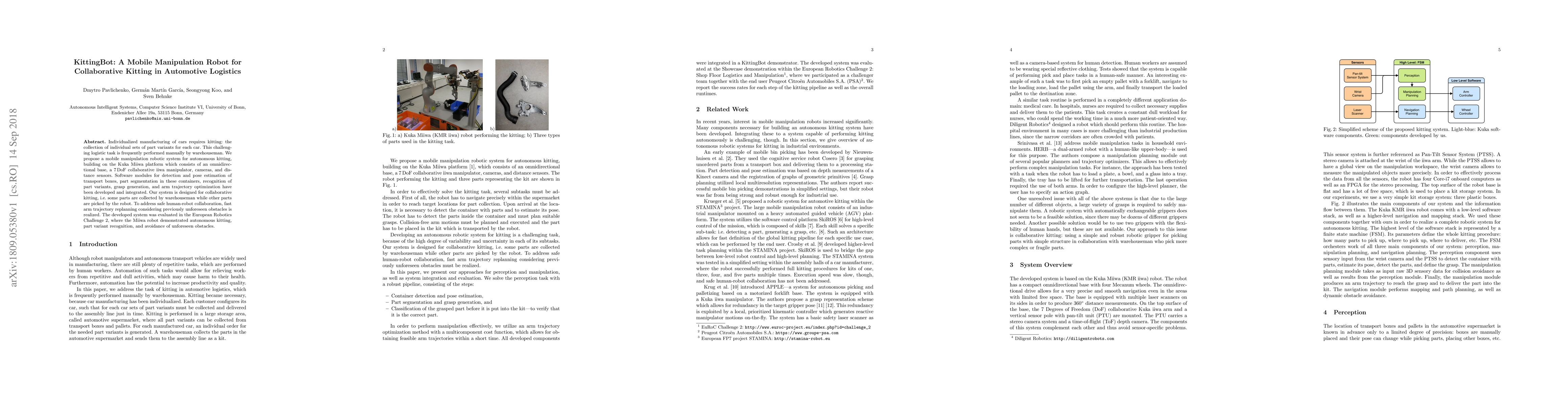 The research introduces KittingBot, a mobile robot system using a Kuka Miiwa platform for collaborative kitting in automotive logistics. It features software for part detection, recognition, grasp generation, and safe human-robot interaction, successfully demonstrated in the European Robotics Challenge 2.