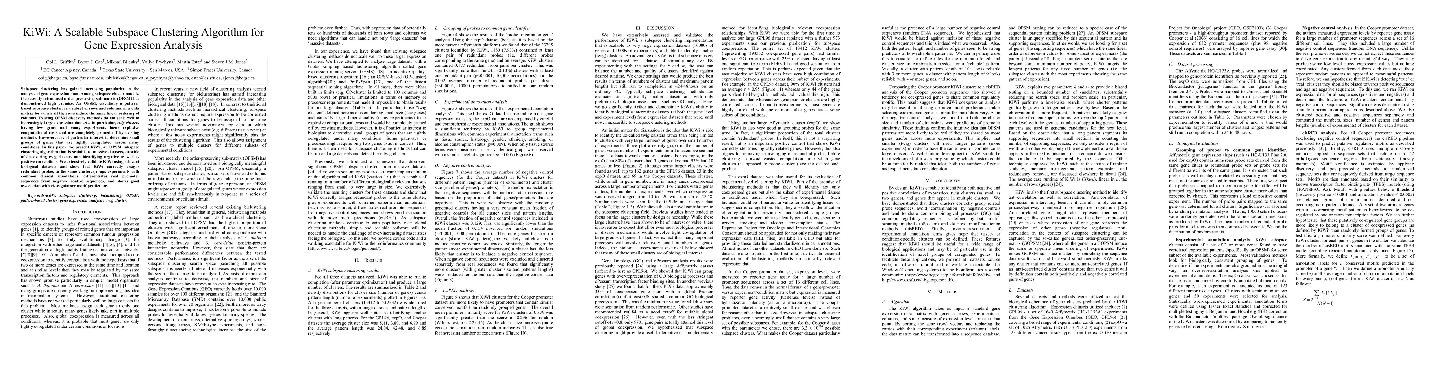 KiWi introduces a novel OPSM-based approach to subspace clustering that leverages density-based clustering to identify biologically relevant clusters.