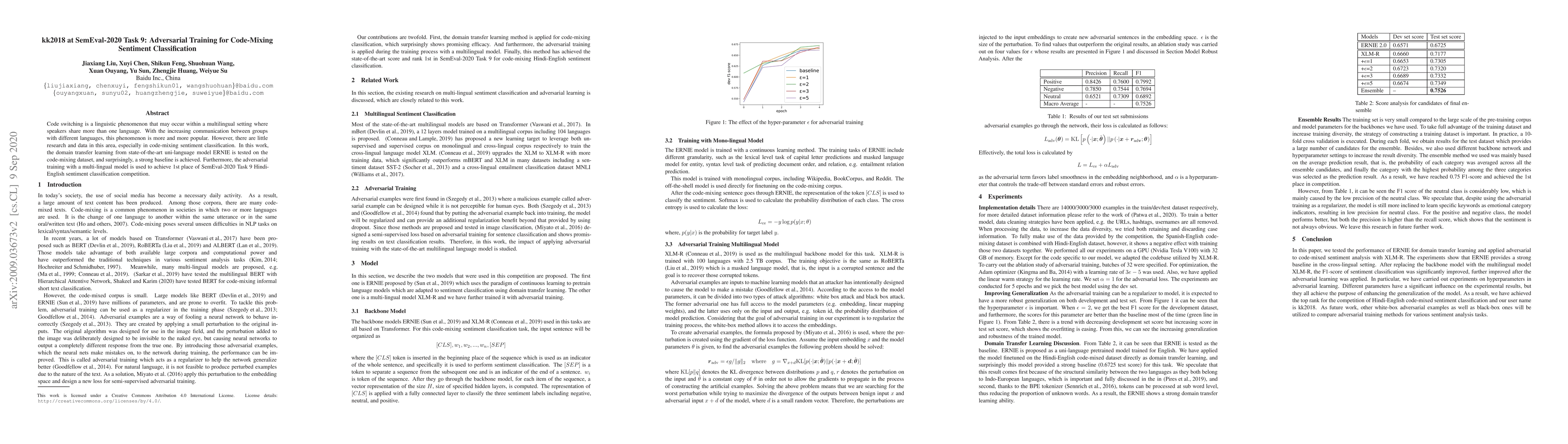 Code switching is a linguistic phenomenon that may occur within a multilingual setting where speakers share more than one language. With the increasing communication between groups with different languages, this phenomenon is more and more popular. However, there are little research and data in this area, especially in code-mixing sentiment classification. In this work, the domain transfer learning from state-of-the-art uni-language model ERNIE is tested on the code-mixing dataset, and surprisingly, a strong baseline is achieved. Furthermore, the adversarial training with a multi-lingual model is used to achieve 1st place of SemEval-2020 Task 9 Hindi-English sentiment classification competition.