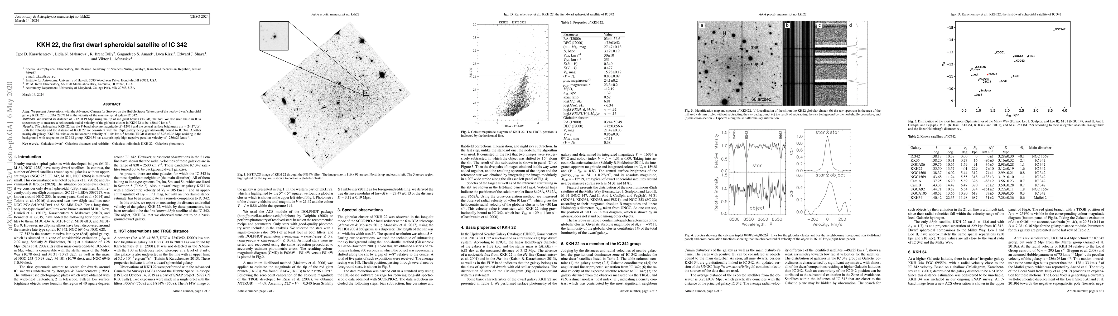 This paper presents observations of the dwarf spheroidal galaxy KKH 22, revealing its distance to be 3.12±0.19 Mpc, and its radial velocity to be +30±10 km/s, indicating gravitational binding to the nearby spiral galaxy IC 342. A comparison with another nearby galaxy, KKH 34, shows it to be in the background with a significantly higher peculiar velocity.