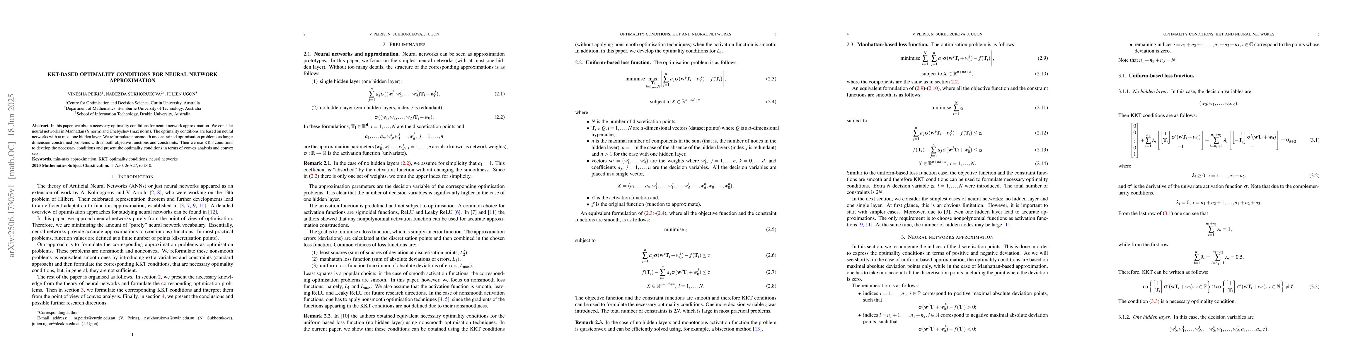 In this paper, we obtain necessary optimality conditions for neural network approximation. We consider neural networks in Manhattan ($l_1$ norm) and Chebyshev ($\max$ norm). The optimality conditions are based on neural networks with at most one hidden layer. We reformulate nonsmooth unconstrained optimisation problems as larger dimension constrained problems with smooth objective functions and constraints. Then we use KKT conditions to develop the necessary conditions and present the optimality conditions in terms of convex analysis and convex sets.
