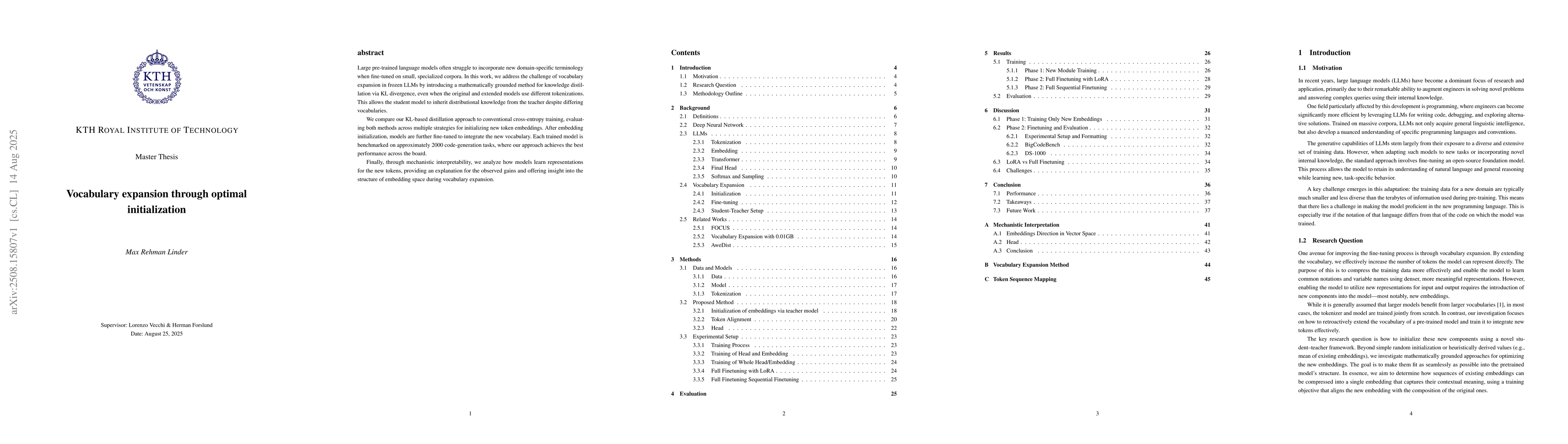 Large pre-trained language models often struggle to incorporate new domain-specific terminology when fine-tuned on small, specialized corpora. In this work, we address the challenge of vocabulary expansion in frozen LLMs by introducing a mathematically grounded method for knowledge distillation via KL divergence, even when the original and extended models use different tokenizations. This allows the student model to inherit distributional knowledge from the teacher despite differing vocabularies. We compare our KL-based distillation approach to conventional cross-entropy training, evaluating both methods across multiple strategies for initializing new token embeddings. After embedding initialization, models are further fine-tuned to integrate the new vocabulary. Each trained model is benchmarked on approximately 2000 code-generation tasks, where our approach achieves the best performance across the board. Finally, through mechanistic interpretability, we analyze how models learn representations for the new tokens, providing an explanation for the observed gains and offering insight into the structure of embedding space during vocabulary expansion.